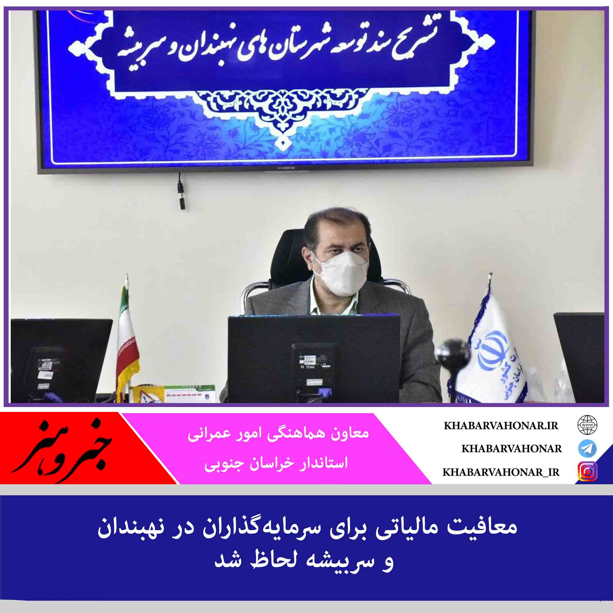 معاون هماهنگی امور عمرانی استاندار خراسان جنوبی گفت: باید دست بخش خصوصی را باز بگذاریم لذا در سند توسعه پیشنهادی برای شهرستانهای نهبندان و سربیشه، معافیت مالیاتی درازمدت ۲۰ ساله برای سرمایهگذاران لحاظ شده است.