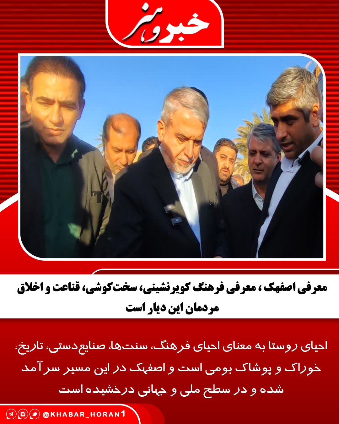 به گزارش خبر و هنر وزیر میراث فرهنگی همچنین با تشکر از صداوسیمای استان خراسان جنوبی خواستار تولید و انعکاس محتوای رسانهای بیشتر از شهرستان طبس و روستای اصفهک شد و گفت: معرفی اصفهک تنها معرفی خشت و گل نیست، بلکه معرفی فرهنگ کویرنشینی، سختکوشی، قناعت و اخلاق مردمان این دیار است.