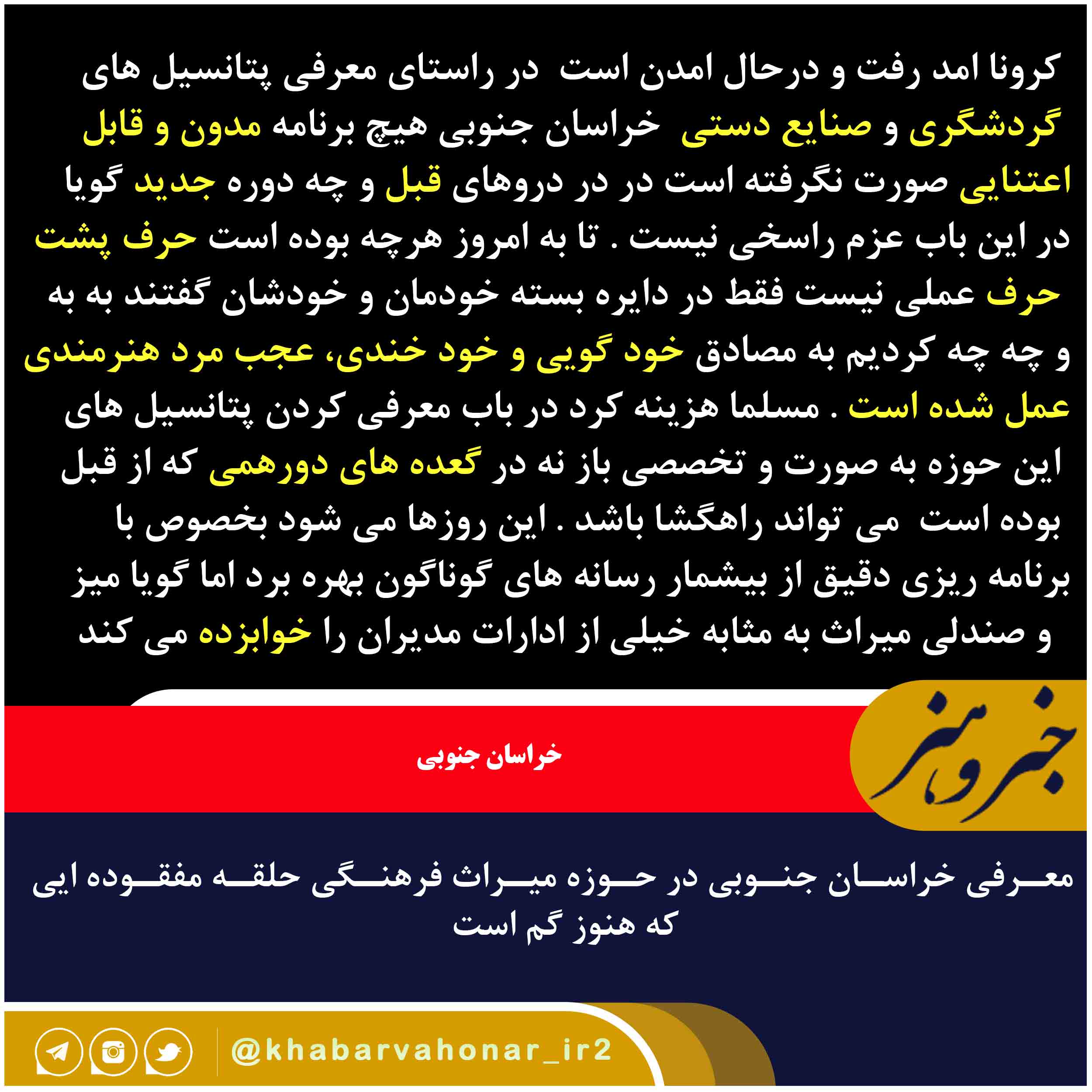 کرونا امد رفت و درحال امدن است در راستای معرفی پتانسیل های گردشگری و صنایع دستی خراسان جنوبی هیچ برنامه مدون و قابل اعتنایی صورت نگرفته است در در دروهای قبل و چه دوره جدید گویا در این باب عزم راسخی نیست . تا به امروز هرچه بوده است حرف پشت حرف عملی نیست فقط در دایره بسته خودمان و خودشان گفتند به به و چه چه کردیم به مصادق خود گویی و خود خندی، عجب مرد هنرمندی عمل شده است . مسلما هزینه کرد در باب معرفی کردن پتانسیل های این حوزه به صورت و تخصصی باز نه در گعده های دورهمی که از قبل بوده است می تواند راهگشا باشد . این روزها می شود بخصوص با برنامه ریزی دقیق از بیشمار رسانه های گوناگون بهره برد اما گویا میز و صندلی میراث به مثابه خیلی از ادارات مدیران را خوابزده می کند