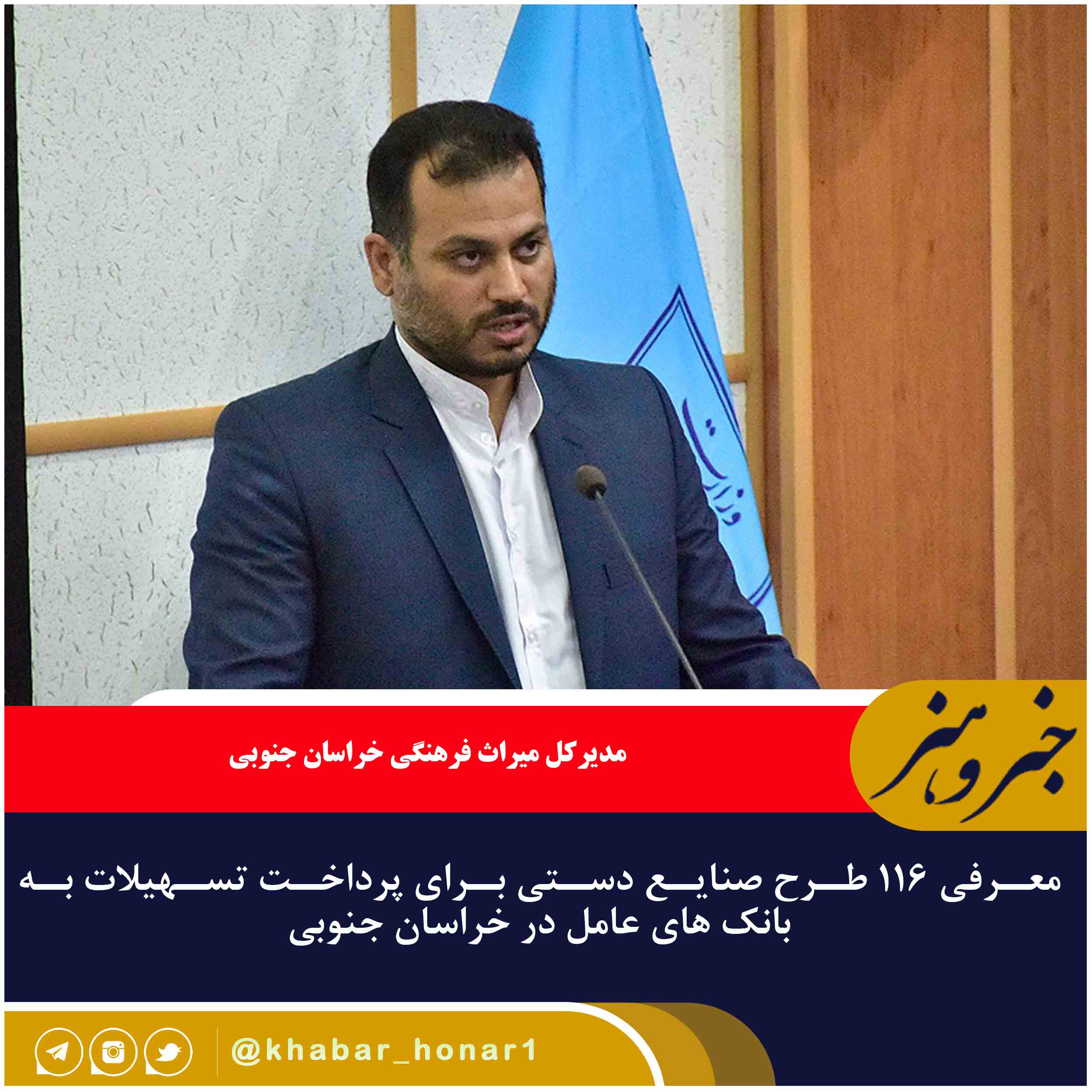 مدیرکل میراث فرهنگی خراسان جنوبی گفت: طی هفت ماه گذشته ۱۱۶ طرح صنایع دستی به مبلغ ۷۸ میلیارد ریال برای اخذ تسهیلات به بانکهای عامل خراسان جنوبی معرفی شده است.