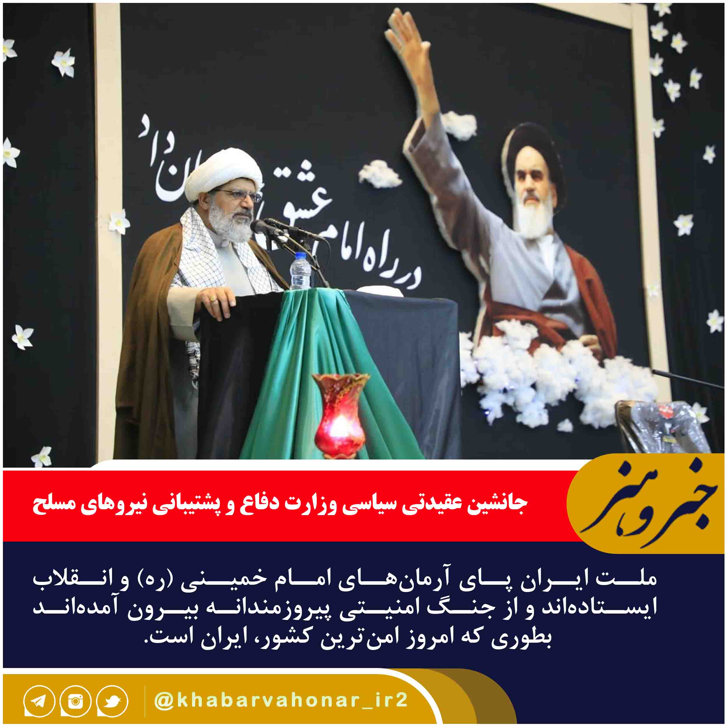 جانشین عقیدتی سیاسی وزارت دفاع و پشتیبانی نیروهای مسلح گفت: ملت ایران پای آرمانهای امام خمینی (ره) و انقلاب ایستادهاند و از جنگ امنیتی پیروزمندانه بیرون آمدهاند بطوری که امروز امنترین کشور، ایران است.