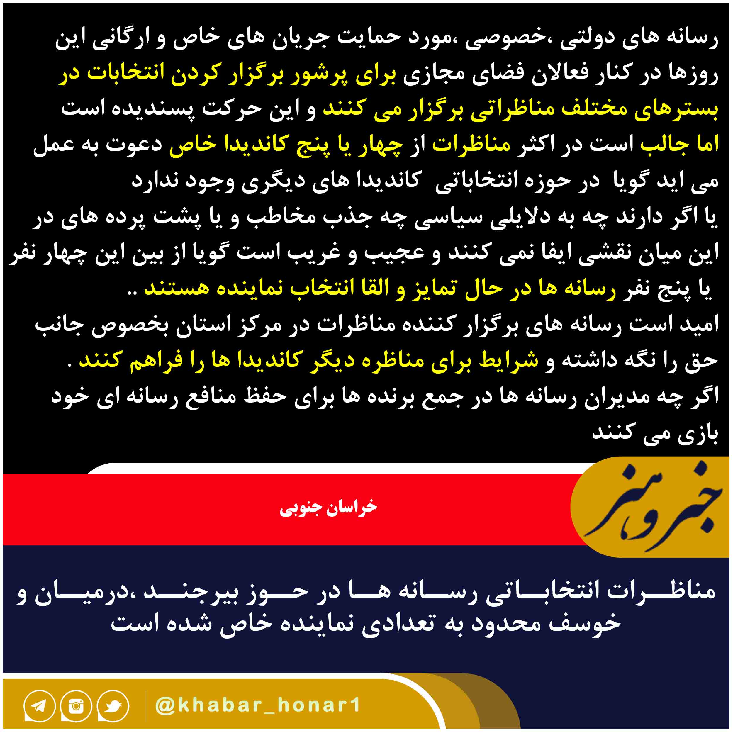 رسانه های دولتی ،خصوصی ،مورد حمایت جریان های خاص و ارگانی این روزها در کنار فعالان فضای مجازی برای پرشور برگزار کردن انتخابات در بسترهای مختلف مناظراتی برگزار می کنند و این حرکت پسندیده است اما جالب است در اکثر مناظرات از چهار یا پنج کاندیدا خاص دعوت به عمل می اید گویا در حوزه انتخاباتی کاندیدا های دیگری وجود ندارد یا اگر دارند چه به دلایلی سیاسی چه جذب مخاطب و یا پشت پرده های در این میان نقشی ایفا نمی کنند و عجیب و غریب است گویا از بین این چهار نفر یا پنج نفر رسانه ها در حال تمایز و القا انتخاب نماینده هستند .. امید است رسانه های برگزار کننده مناظرات در مرکز استان بخصوص جانب حق را نگه داشته و شرایط برای مناظره دیگر کاندیدا ها را فراهم کنند . اگر چه مدیران رسانه ها در جمع برنده ها برای حفظ منافع رسانه ای خود بازی می کنند