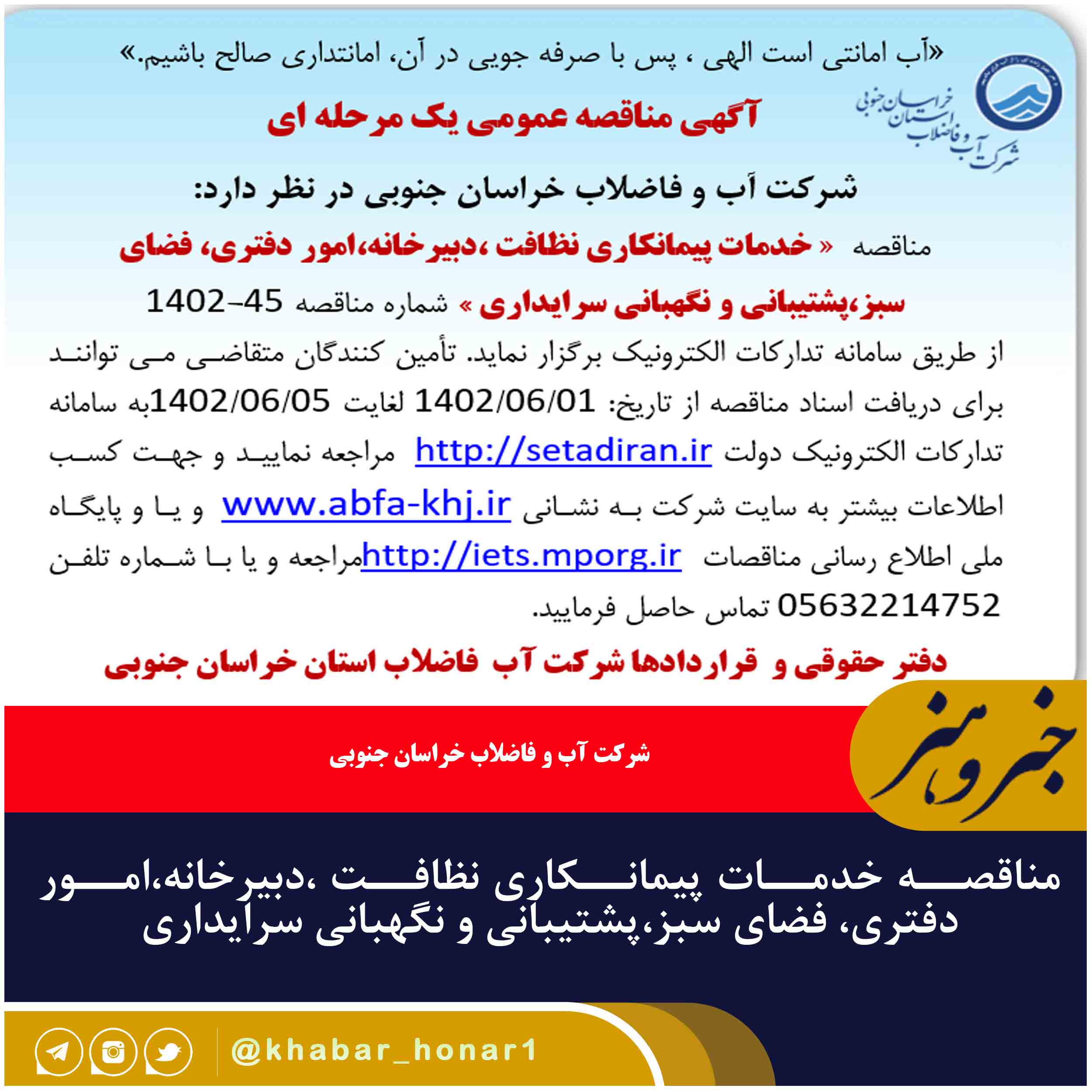 از طریق سامانه تدارکات الکترونیک برگزار نماید. تأمین کنندگان متقاضی می توانند برای دریافت اسناد مناقصه از تاریخ: ۰۱/۰۶/۱۴۰۲ لغایت ۰۵/۰۶/۱۴۰۲به سامانه تدارکات الکترونیک دولت http://setadiran.ir مراجعه نمایید و جهت کسب اطلاعات بیشتر به سایت شرکت به نشانی www.abfa-khj.ir و یا و پایگاه ملی اطلاع رسانی مناقصات http://iets.mporg.ir مراجعه و یا با شماره تلفن ۰۵۶۳۲۲۱۴۷۵۲ تماس حاصل فرمایید.
