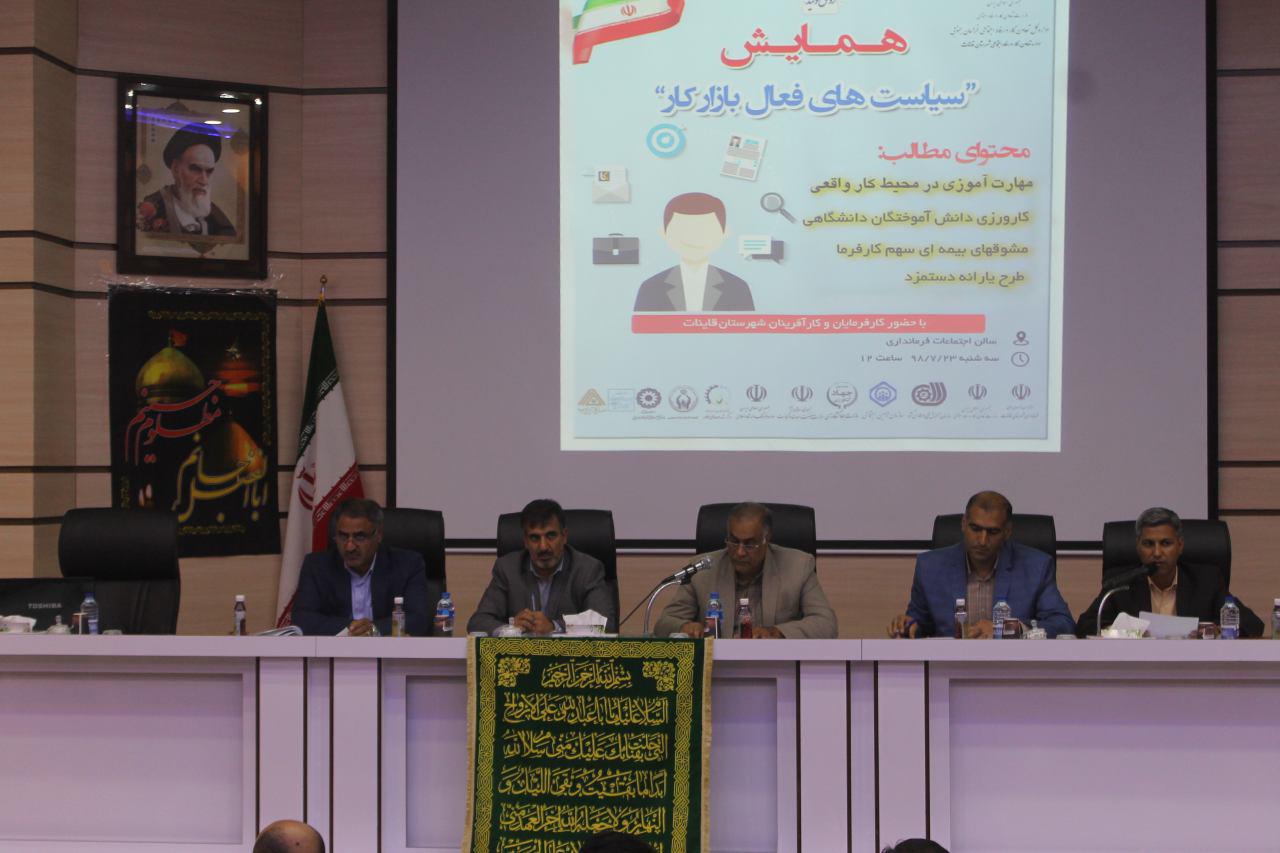 همایش سیاست های فعال بازار کار با حضور مدیران کل آموزش فنی و حرفه ای، تعاون، کار و رفاه اجتماعی، فرماندار قائن،جمعی از مدیران شهرستان، مدیران صنایع، صنوف و فعالان اقتصادی در محل سالن جلسات فرمانداری قاین برگزار شد.
