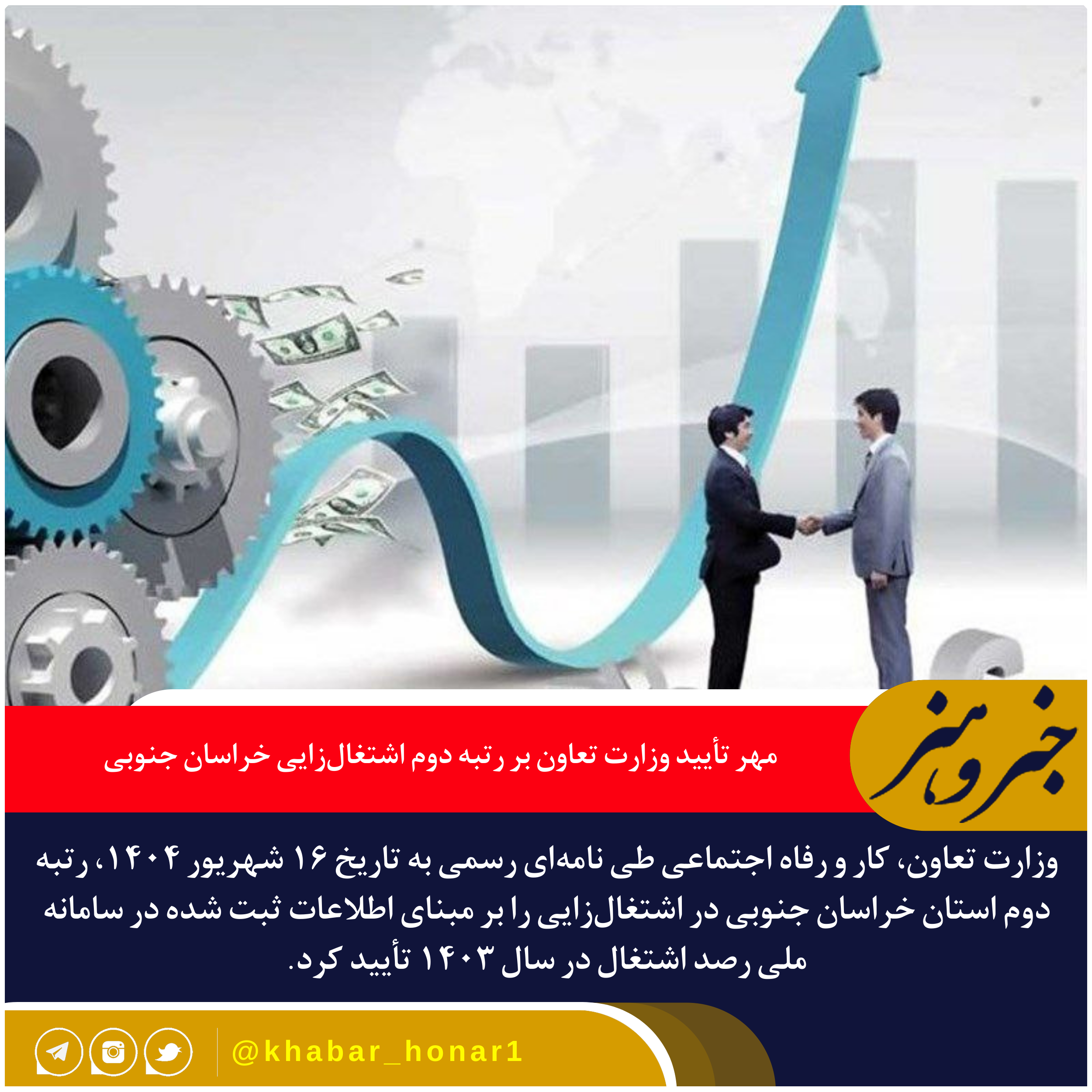 به گزارش خبر و هنر، وزارت تعاون، کار و رفاه اجتماعی طی نامهای رسمی به تاریخ ۱۶ شهریور ۱۴۰۴، رتبه دوم استان خراسان جنوبی در اشتغالزایی را بر مبنای اطلاعات ثبت شده در سامانه ملی رصد اشتغال در سال ۱۴۰۳ تأیید کرد.