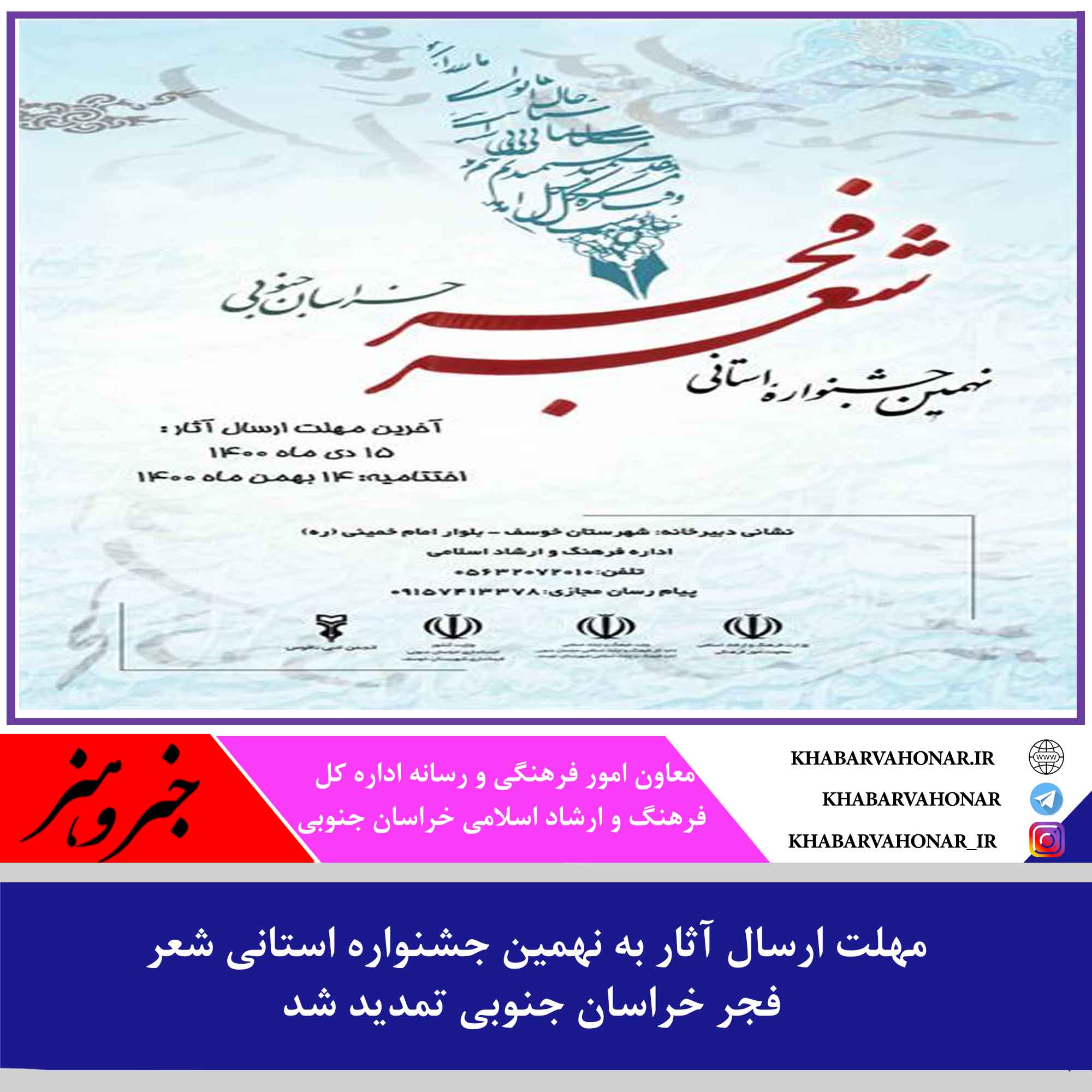 معاون امور فرهنگی و رسانه اداره کل فرهنگ و ارشاد اسلامی خراسان جنوبی از تمدید ارسال آثار به نهمین جشنواره استانی شعر فجر تا ۲۳ دی ماه سالجاری خبر داد.