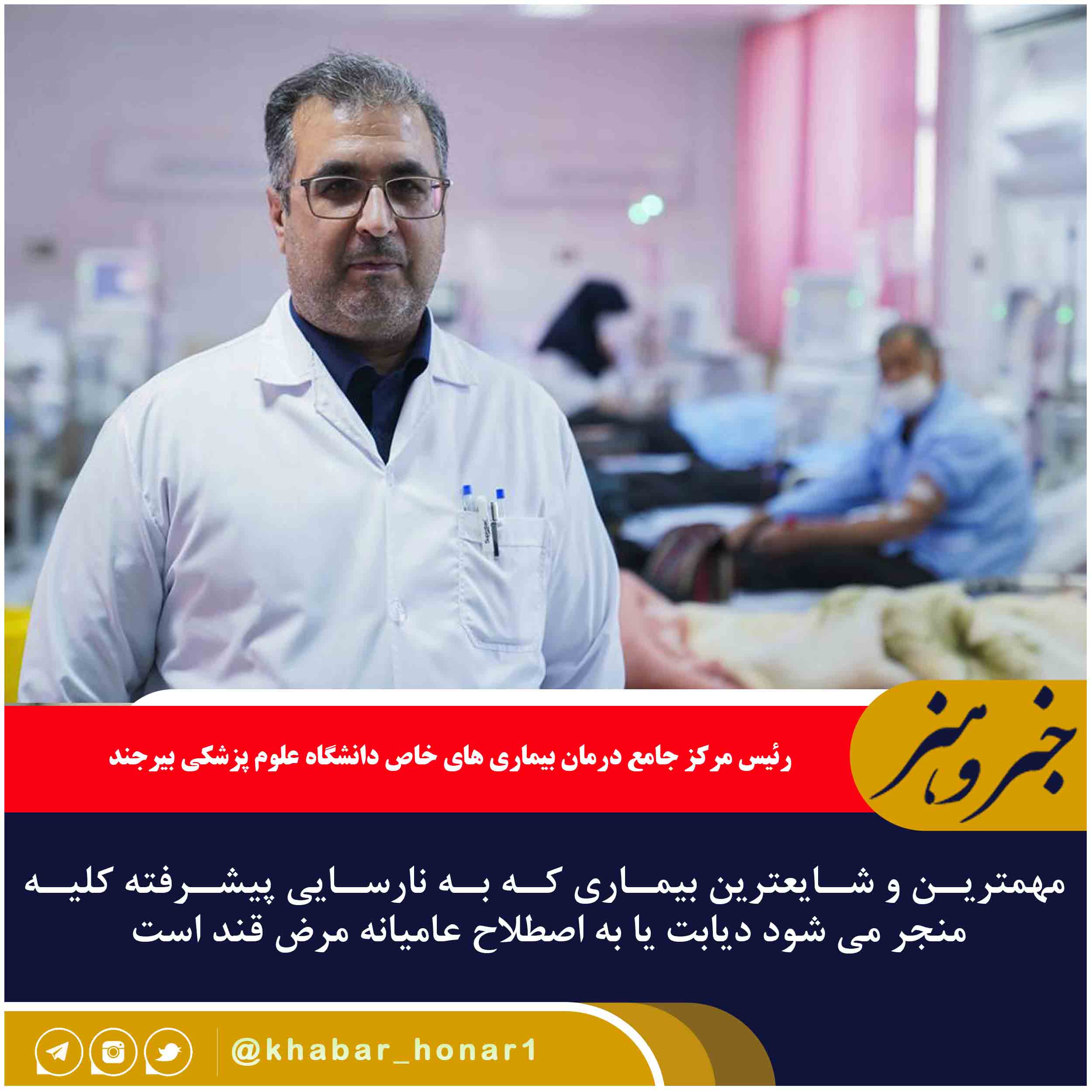 رئیس مرکز جامع درمان بیماری های خاص با توصیه به بیماران فشاران خونی، که اگر این بیماری به خوبی کنترل نشود، در نهایت به نارسایی پیشرفته کلیه منجر می شود گفت: این بیماران نیز در این صورت نیاز به درمان جایگزینی دیالیز خونی یا صفاقی پیدا می کنند، بنابراین حتما باید به صورت دوره ای به پزشک مراجعه نمایند و در برخی موارد نیاز است دارو و یا دز دارویی بیمار تغییر کند
