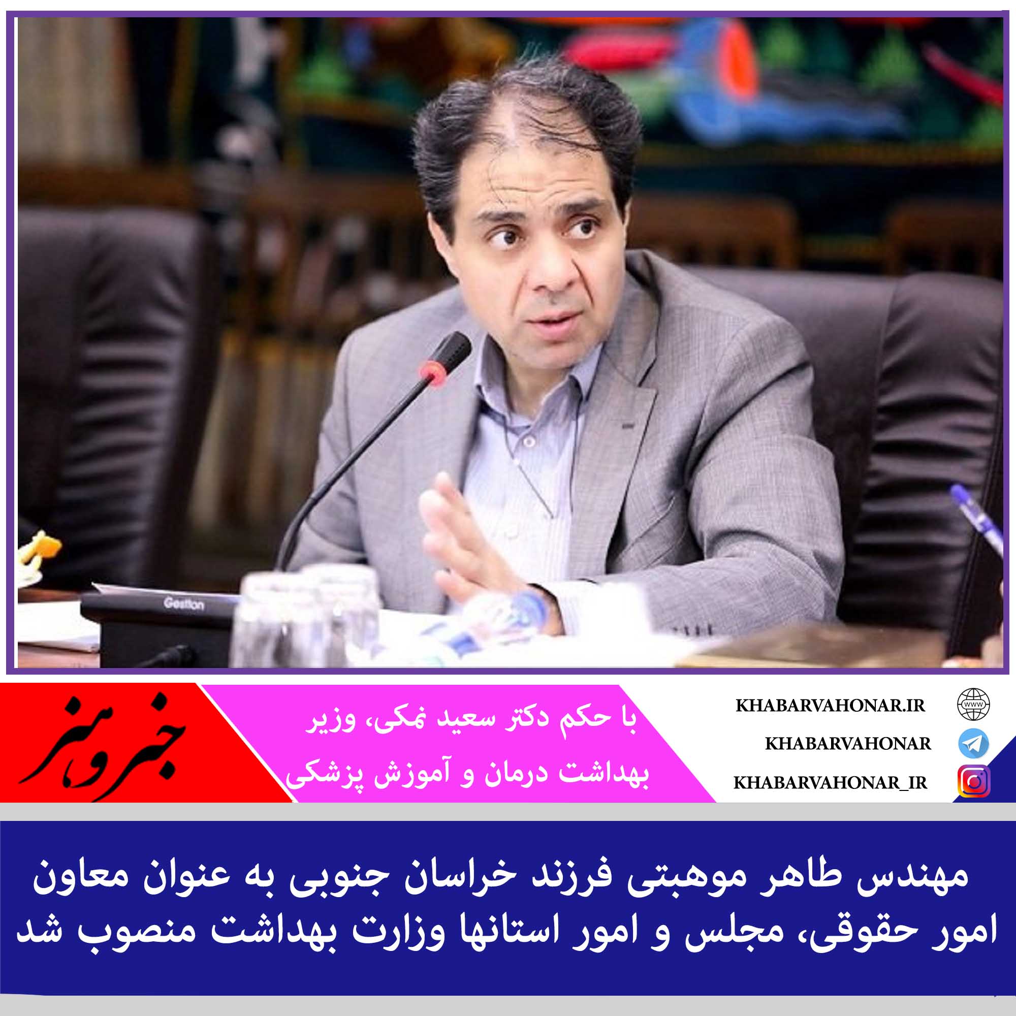 دکتر سعید نمکی، وزیر بهداشت درمان و آموزش پزشکی، در حکمی، مهندس طاهر موهبتی را به عنوان معاون امور حقوقی، مجلس و امور استانها منصوب کرد.