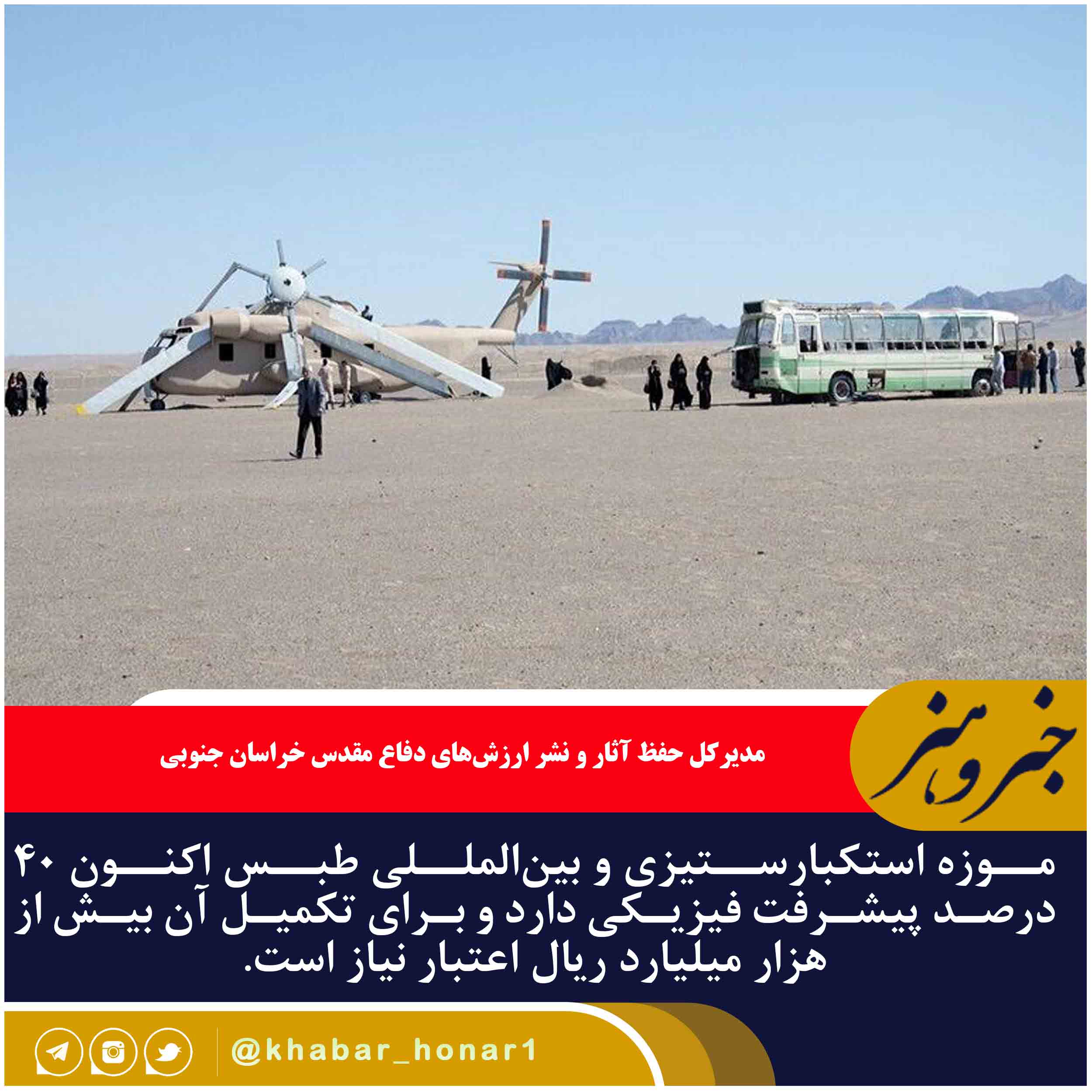 مدیرکل حفظ آثار و نشر ارزشهای دفاع مقدس خراسان جنوبی گفت: موزه استکبارستیزی و بینالمللی طبس اکنون ۴۰ درصد پیشرفت فیزیکی دارد و برای تکمیل آن بیش از هزار میلیارد ریال اعتبار نیاز است.