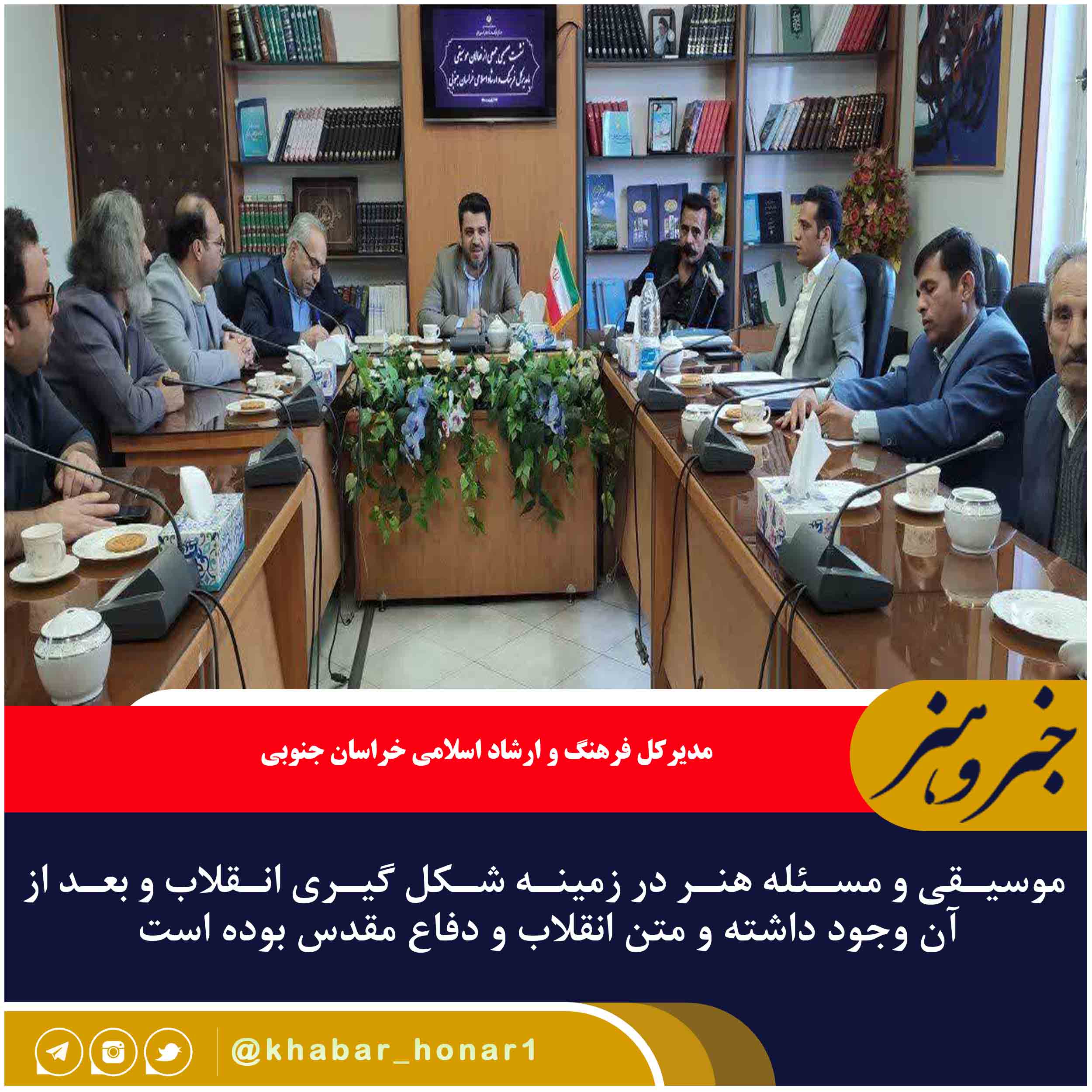 مدیرکل فرهنگ و ارشاد اسلامی خراسان جنوبی در نشست صمیمی با جمعی از فعالان موسیقی استان گفت: در مجموعه فرهنگ و ارشاد اسلامی از هنر و موسیقی فاخر مبتنی بر زیست بوم فرهنگی حمایت می کنیم.