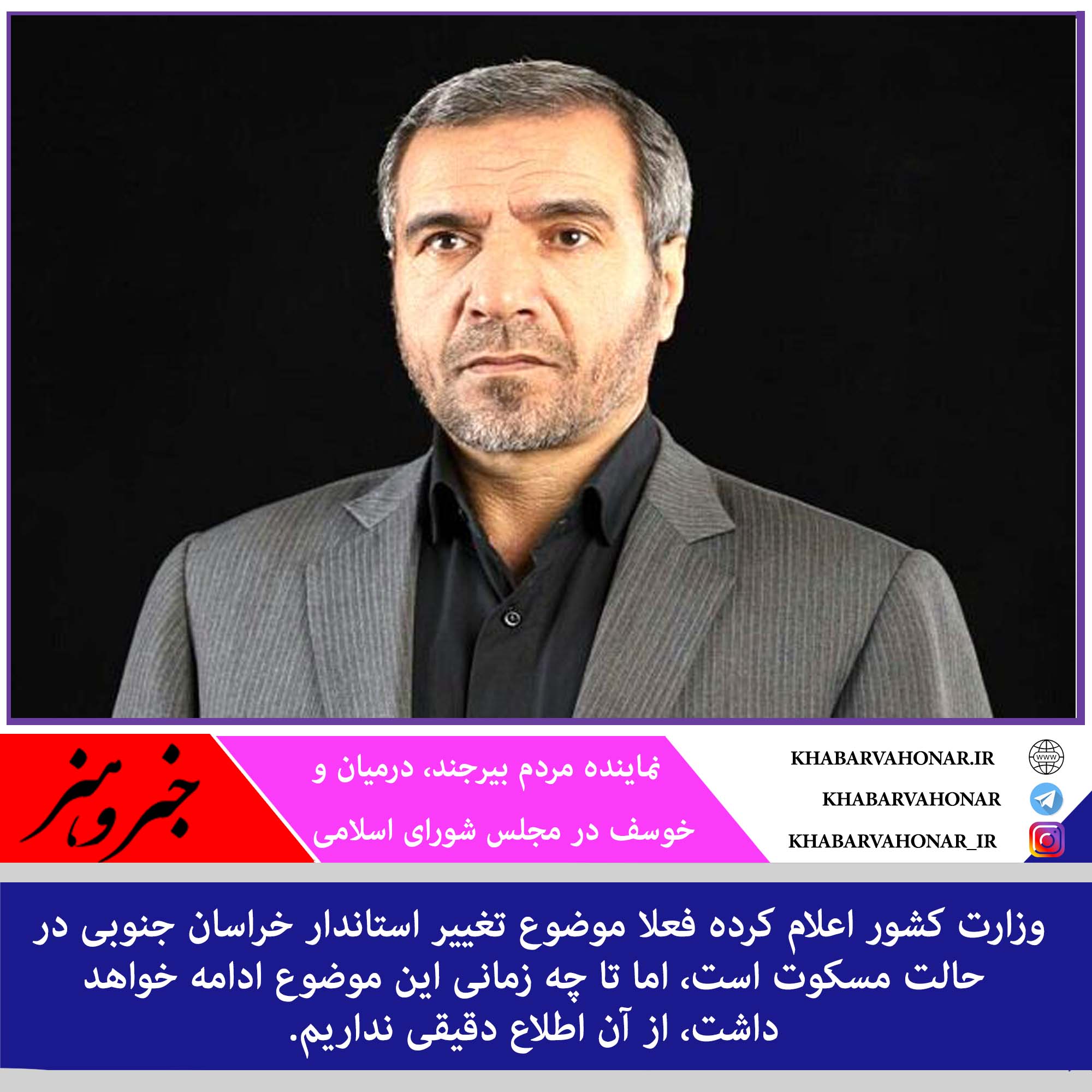 نماینده مردم بیرجند، درمیان و خوسف در مجلس شورای اسلامی گفت: وزارت کشور اعلام کرده فعلا موضوع تغییر استاندار خراسان جنوبی در حالت مسکوت است، اما تا چه زمانی این موضوع ادامه خواهد داشت، از آن اطلاع دقیقی نداریم.