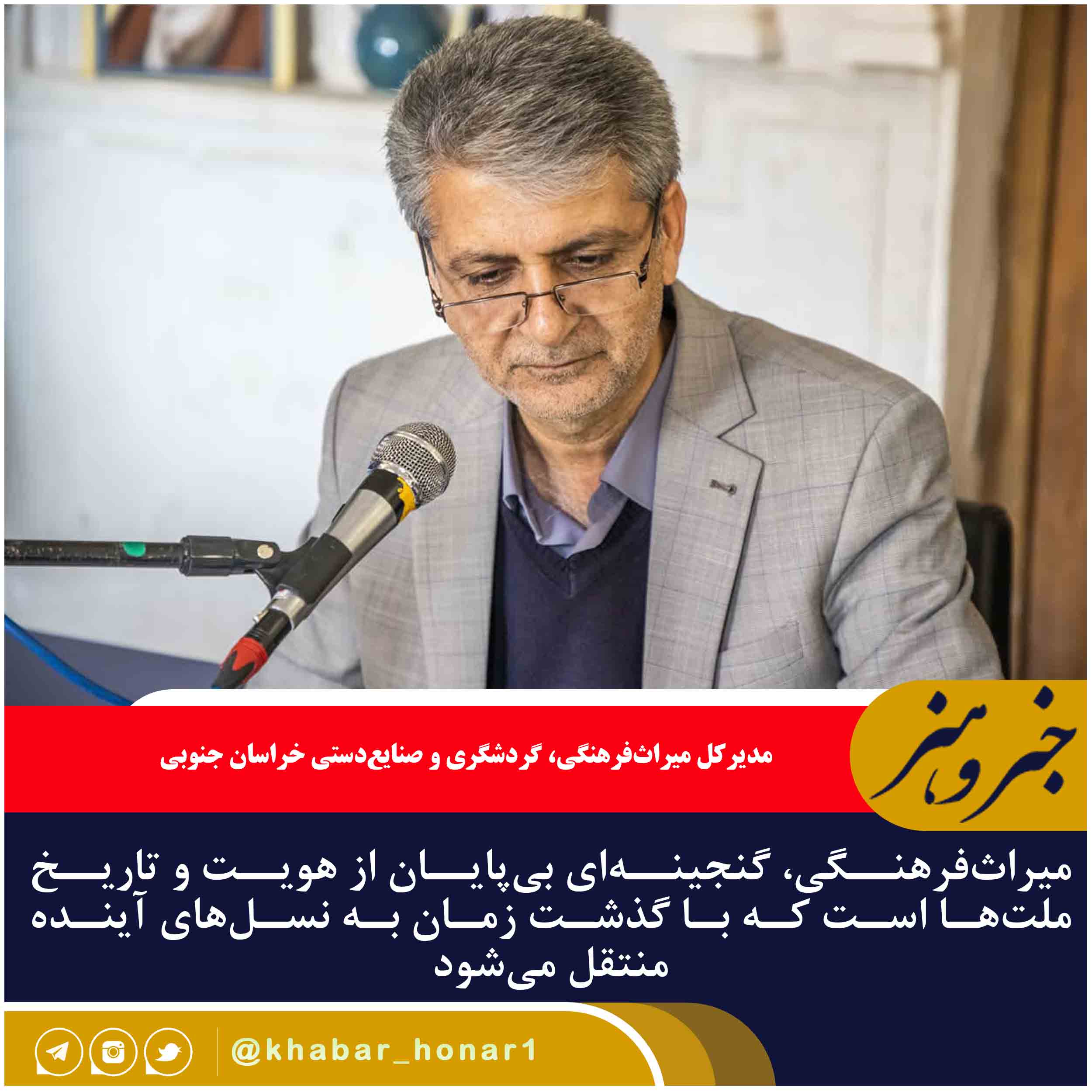 اینجانب ضمن گرامیداشت ۲۸ اردیبهشت «روز جهانی موزه و میراث فرهنگی» ، آغاز هفته میراث فرهنگی را به فعالان حوزه میراث فرهنگی در استان و پرسنل خدوم اداره کل صمیمانه تبریک و تهنیت عرض نموده و از همه کسانی که در حفاظت، معرفی و احیای این میراث ارزشمند کوشا هستند، تقدیر میکنم. امیدوارم با همت جمعی و همافزایی بیشتر، بتوانیم استان خراسان جنوبی را بهعنوان الگویی برای حفاظت از میراث فرهنگی و توسعه گردشگری پایدار به جهانیان معرفی کنیم .