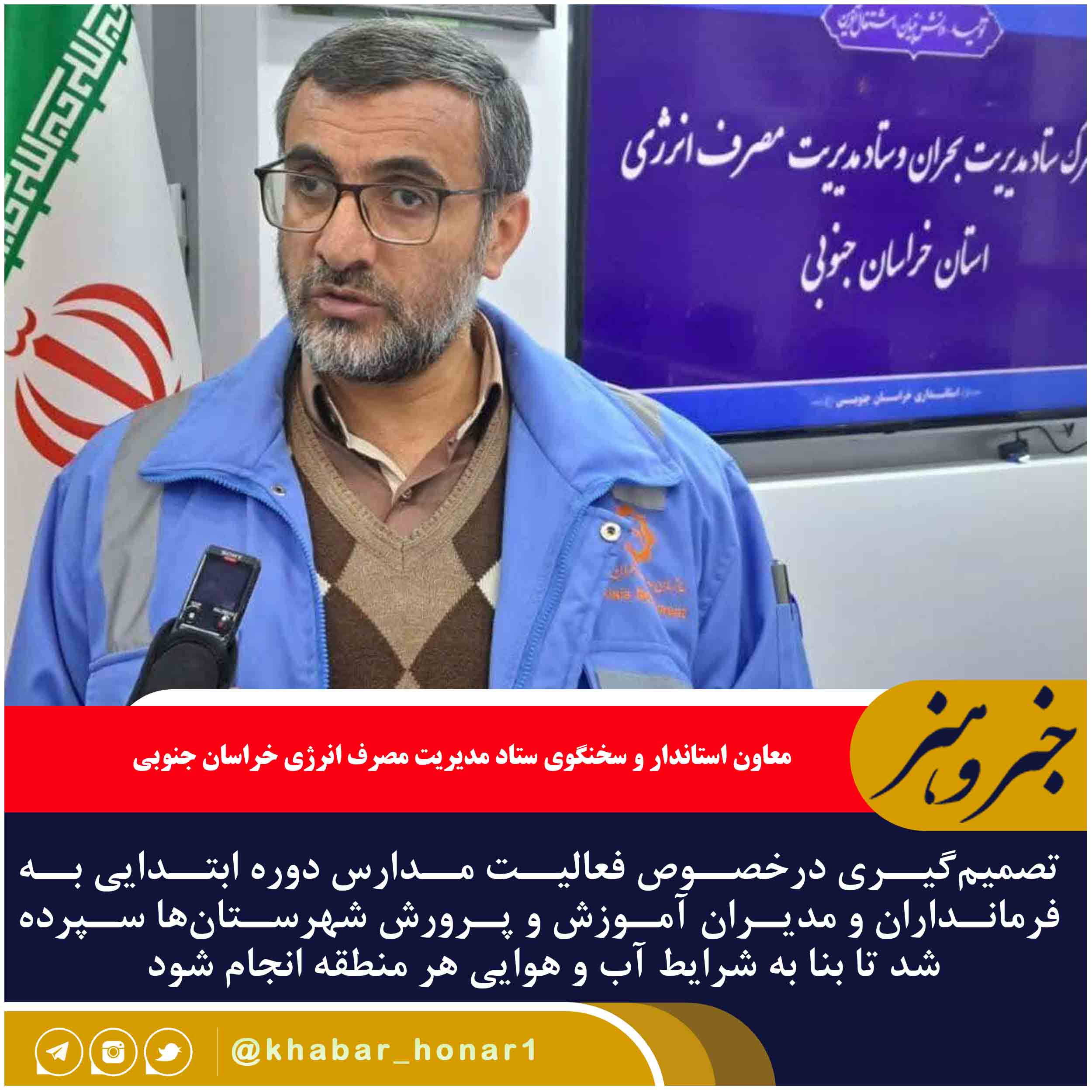 معاون استاندار و سخنگوی ستاد مدیریت مصرف انرژی خراسان جنوبی گفت: تصمیمگیری درخصوص فعالیت مدارس دوره ابتدایی به فرمانداران و مدیران آموزش و پرورش شهرستانها سپرده شد تا بنا به شرایط آب و هوایی هر منطقه انجام شود.