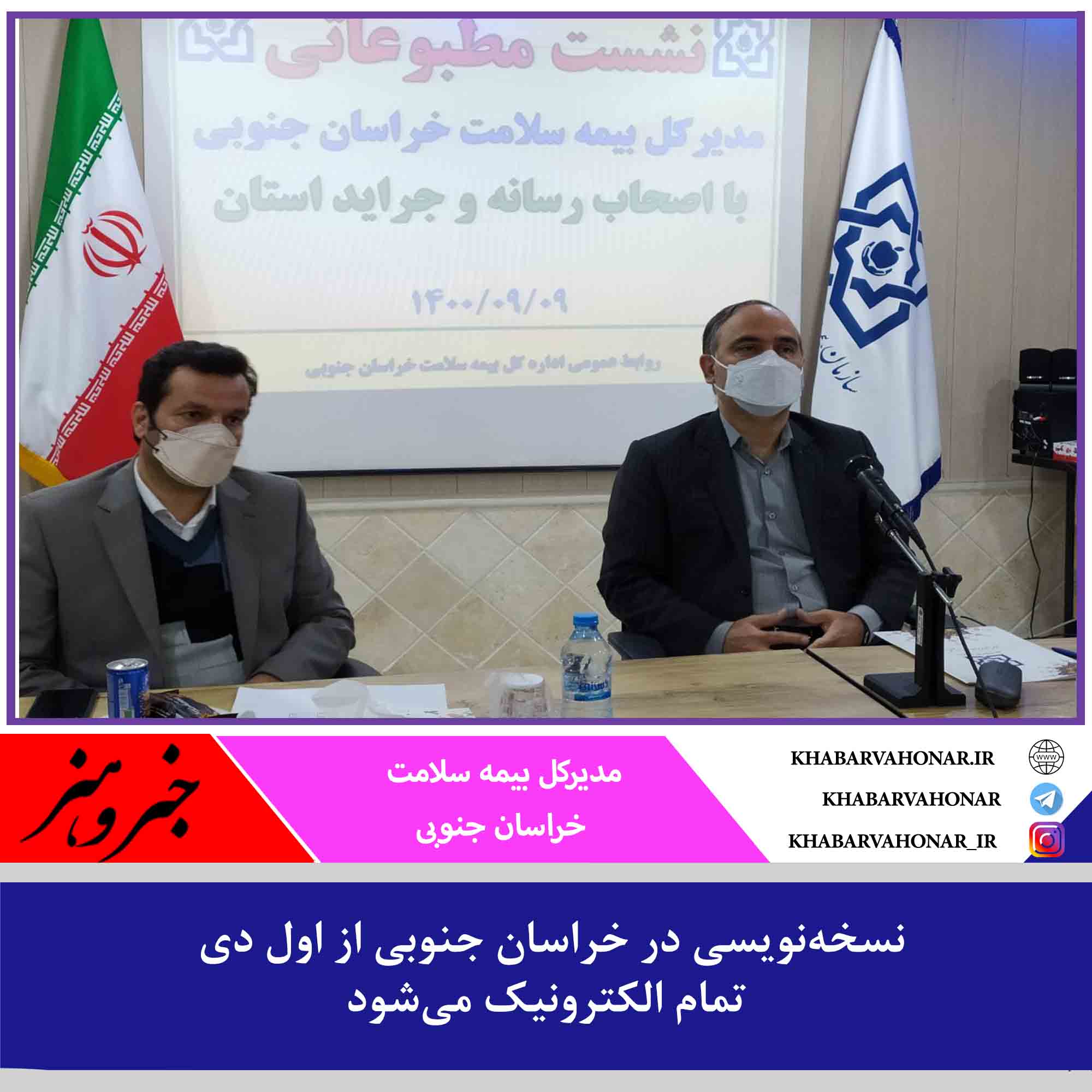 مدیرکل بیمه سلامت خراسان جنوبی گفت: از ابتدای دی امسال تمامی نسخههای پزشکی در این استان به صورت کاملا الکترونیک ارائه خواهد شد و امکان پرداخت برای نسخ خطی را نخواهیم داشت.