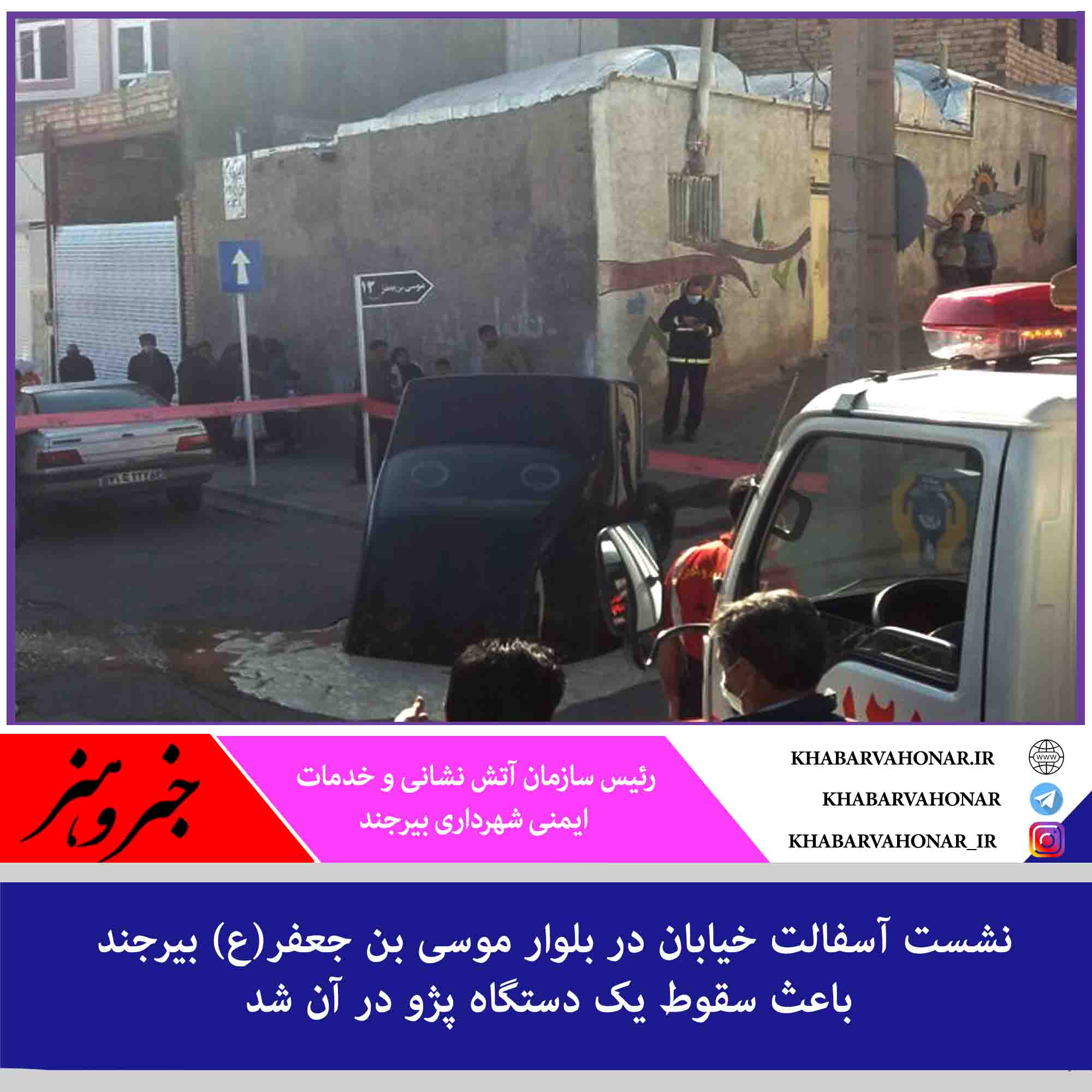 رئیس سازمان آتش نشانی و خدمات ایمنی شهرداری بیرجند اظهار کرد: نشست آسفالت خیابان در بلوار موسی بن جعفر(ع) بیرجند باعث سقوط یک دستگاه پژو در آن شد.