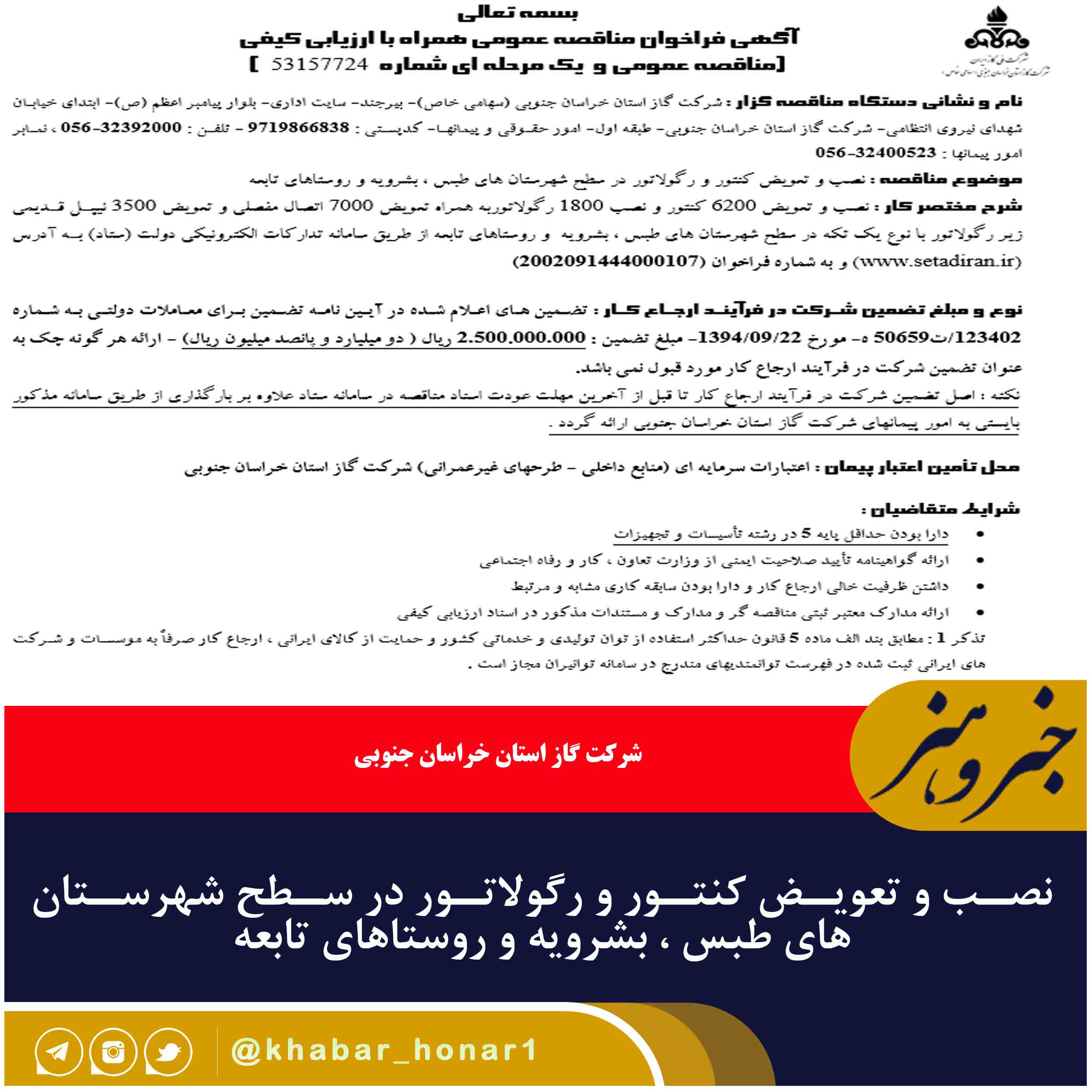 موضوع مناقصه : نصب و تعویض کنتور و رگولاتور در سطح شهرستان های طبس ، بشرویه و روستاهای تابعه