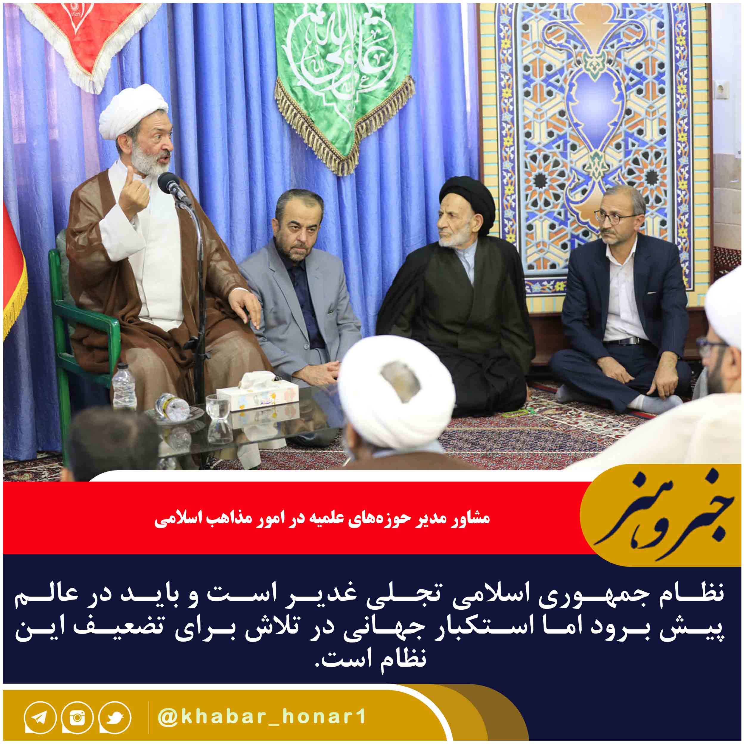 مشاور مدیر حوزههای علمیه در امور مذاهب اسلامی گفت: نظام جمهوری اسلامی تجلی غدیر است و باید در عالم پیش برود اما استکبار جهانی در تلاش برای تضعیف این نظام است.
