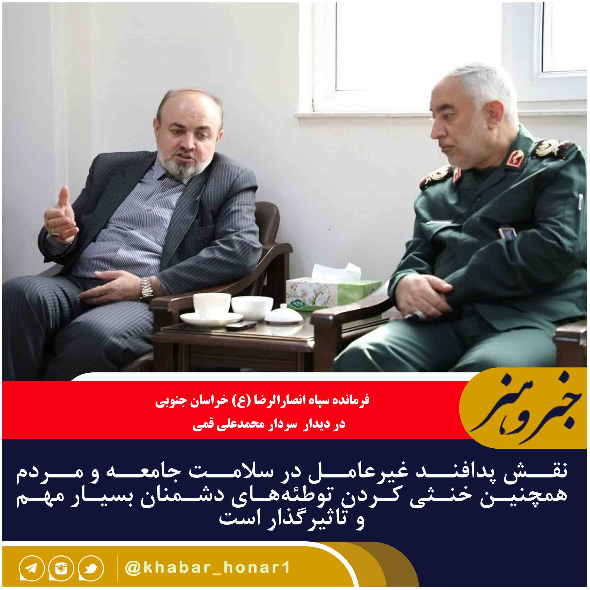 فرمانده سپاه انصارالرضا (ع) خراسان جنوبی در دیدار سردار محمدعلی قمی گفت: نقش پدافند غیرعامل در سلامت جامعه و مردم همچنین خنثی کردن توطئههای دشمنان بسیار مهم و تاثیرگذار است.