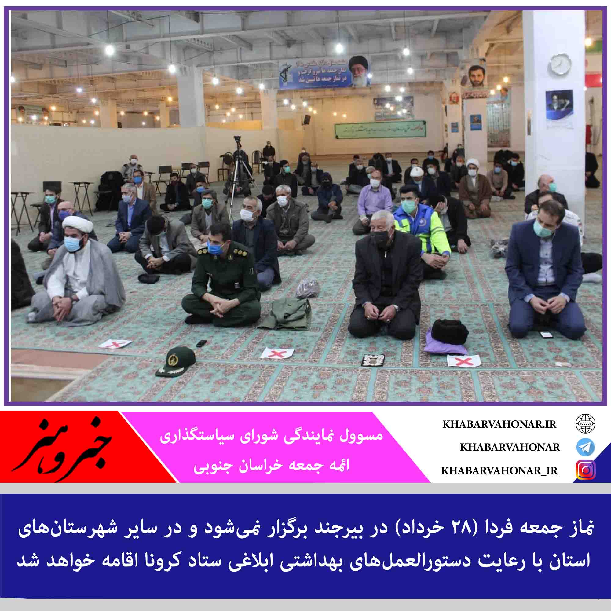 نماز جمعه هفته گذشته (۲۱ خرداد) به جز بیرجند در ۱۰ شهرستان دیگر استان اقامه شد و در مرکز استان از ۱۳ فروردین امسال در پی آغاز روند صعودی ابتلا به کرونا برگزار نشده است.