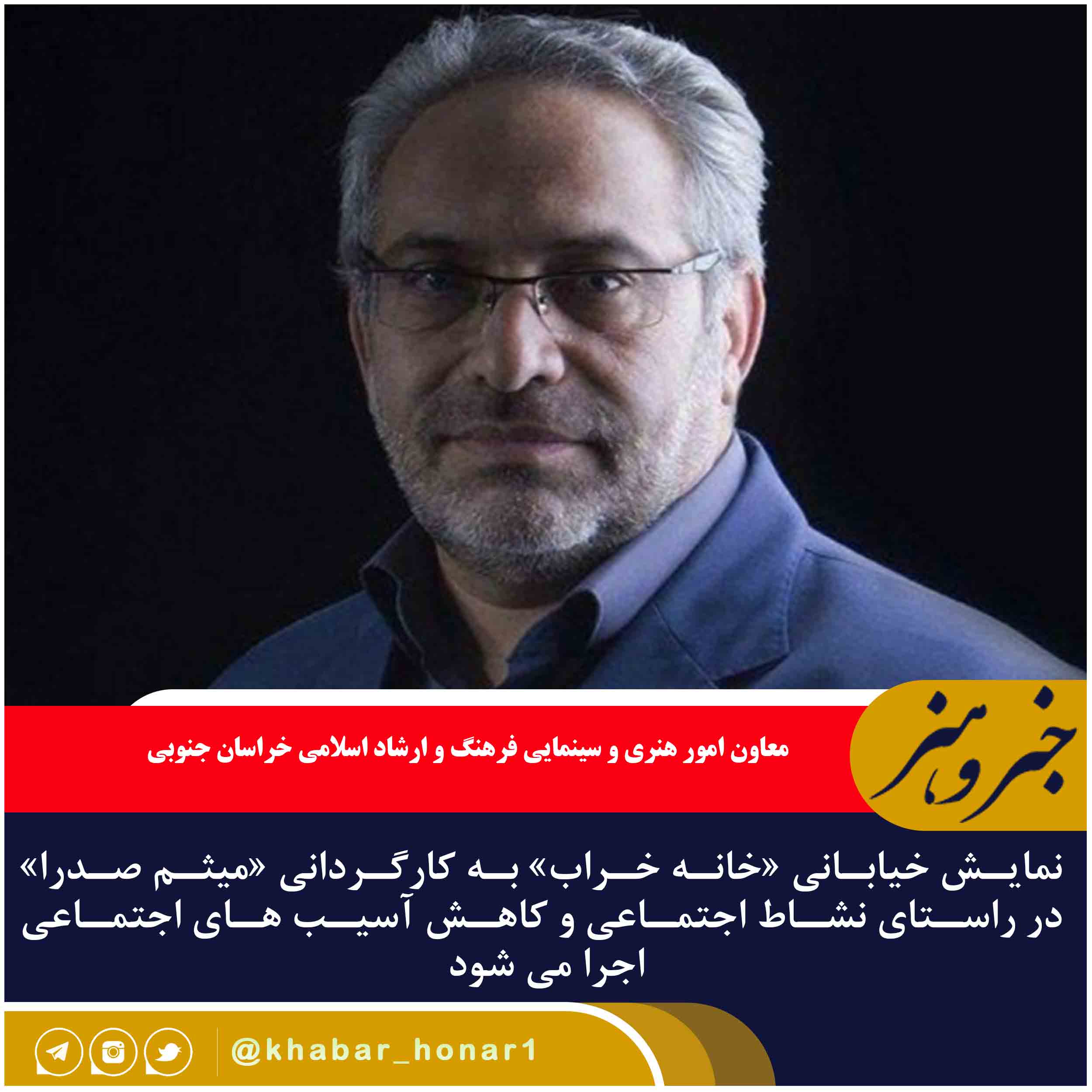 معاون امور هنری و سینمایی فرهنگ و ارشاد اسلامی خراسان جنوبی از اجرای ۳۰ نمایش خیابانی در راستای نشاط اجتماعی و کاهش آسیب اجتماعی طلاق با عنوان «خانه خراب» در استان طی آبان ماه جاری خبر داد.