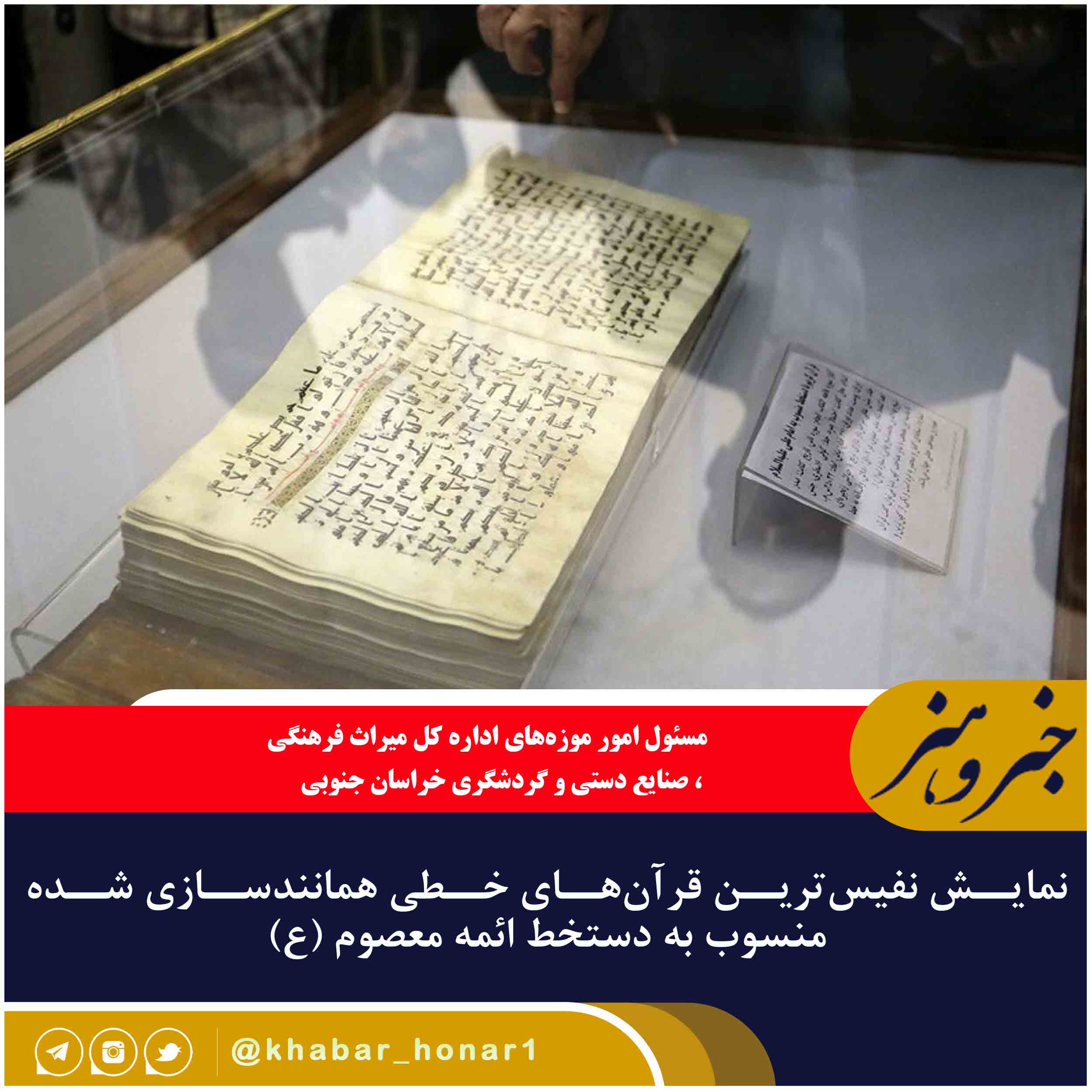 مسئول امور موزههای اداره کل میراث فرهنگی خراسان جنوبی گفت: با توجه به تقارن بهار قرآن و بهار طبیعت (نوروز)، فرصتی به وجود آمد تا برای نخستین بار در استان قرآن منسوب به دستخط ائمه معصوم (ع) به همراه تعدادی از نسخ خطی قرآن از مخزن موزههای استان به نمایشگاه عمومی گذاشته شود.
