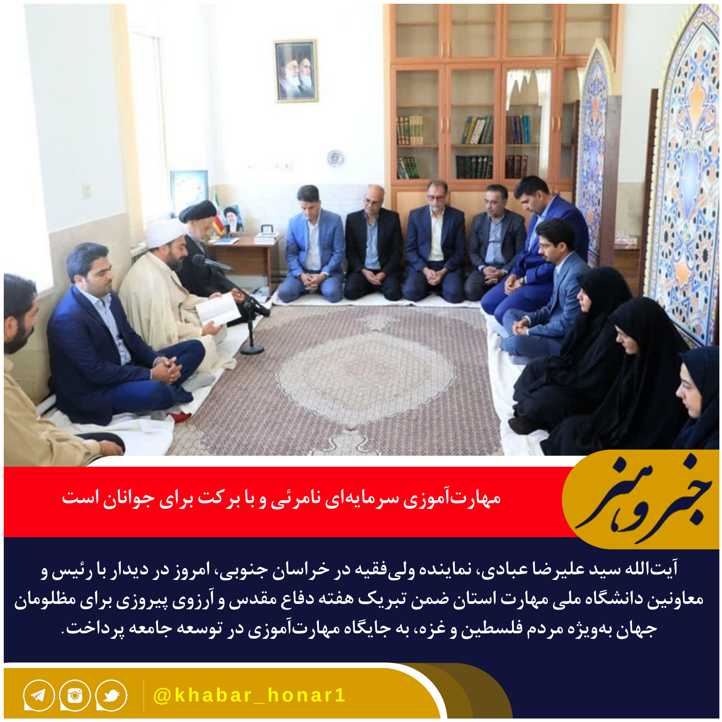 به گزارش خبر و هنر، آیتالله سید علیرضا عبادی، نماینده ولیفقیه در خراسان جنوبی، امروز در دیدار با رئیس و معاونین دانشگاه ملی مهارت استان ضمن تبریک هفته دفاع مقدس و آرزوی پیروزی برای مظلومان جهان بهویژه مردم فلسطین و غزه، به جایگاه مهارتآموزی در توسعه جامعه پرداخت.