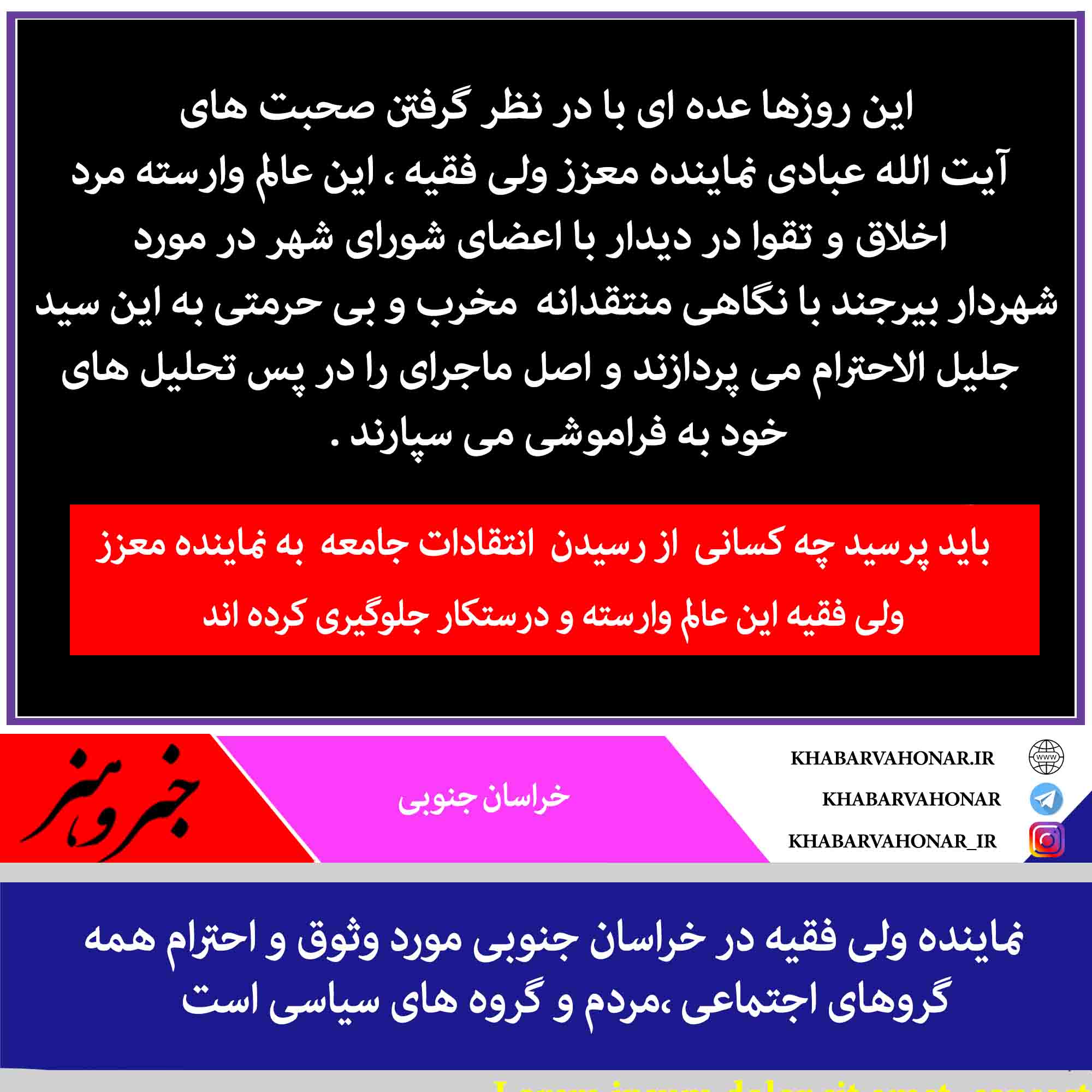 این روزها عده ای با در نظر گرفتن صحبت های آیت الله عبادی نماینده معزز ولی فقیه ، این عالم وارسته مرد اخلاق و تقوا در دیدار با اعضای شورای شهر در مورد شهردار بیرجند با نگاهی منتقدانه مخرب و بی حرمتی به این سید جلیل الاحترام می پردازند و اصل ماجرای را در پس تحلیل های خود به فراموشی می سپارند .