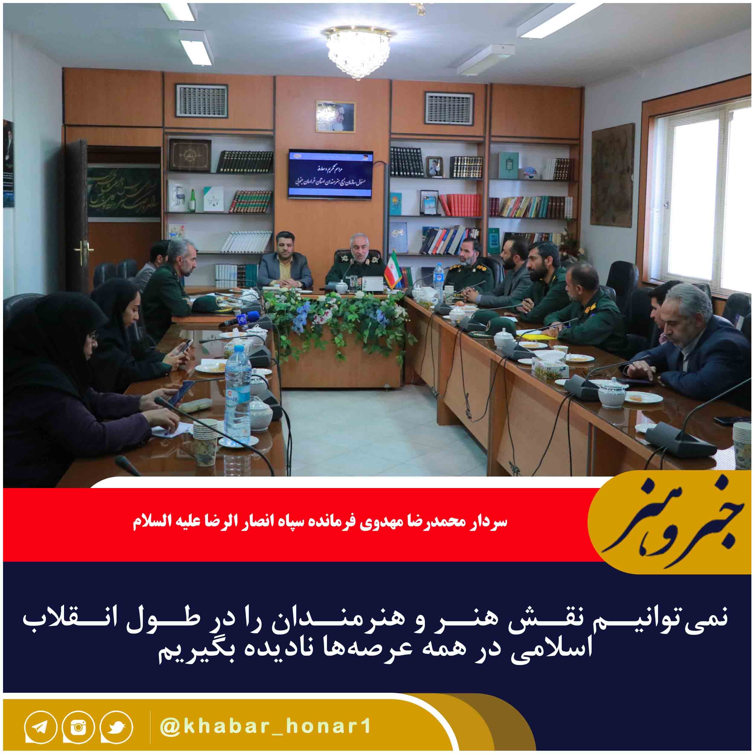 سردار محمدرضا مهدوی فرمانده سپاه انصار الرضا علیه السلام استان در مراسم تکریم و معارفه مسئول بسیج هنرمندان استان با بیان اینکه ما نمیتوانیم نقش هنر و هنرمندان را در طول انقلاب اسلامی در همه عرصهها نادیده بگیریم اظهار داشت: روزهای اول انقلاب و پیروزی انقلاب اسلامی نقش برجسته هنرمندان در سرودهای حماسی که اتفاق می افتاد مردم به خصوص جوانان را به وجد میآورد که در عرصههای مختلف حضور پیدا میکردند و در بسیاری از اقداماتی که در عرصه انقلاب انجام میدادند روحیه مضاعف به آنها می داد.