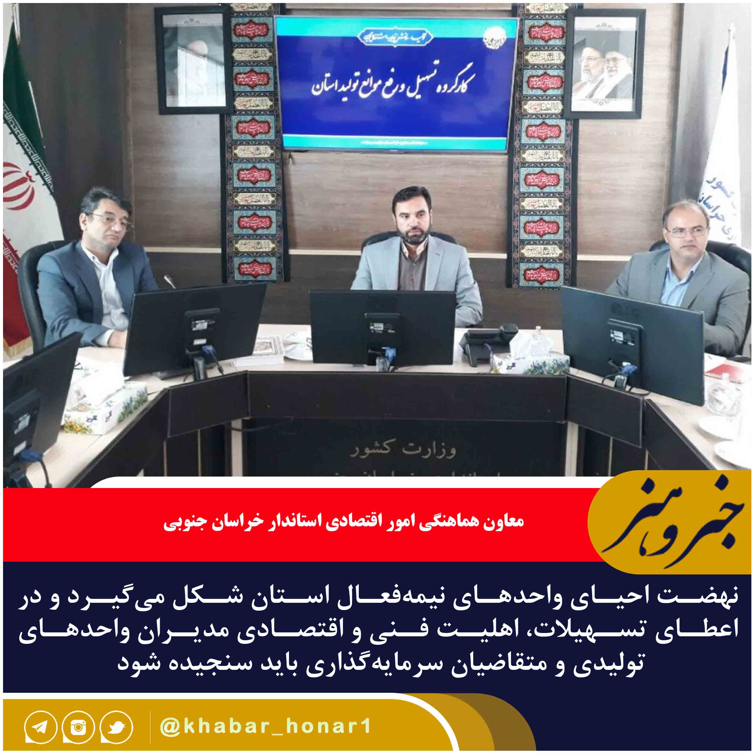 معاون هماهنگی امور اقتصادی استاندار خراسان جنوبی اعلام کرد: نهضت احیای واحدهای نیمهفعال استان شکل میگیرد و در اعطای تسهیلات، اهلیت فنی و اقتصادی مدیران واحدهای تولیدی و متقاضیان سرمایهگذاری باید سنجیده شود.
