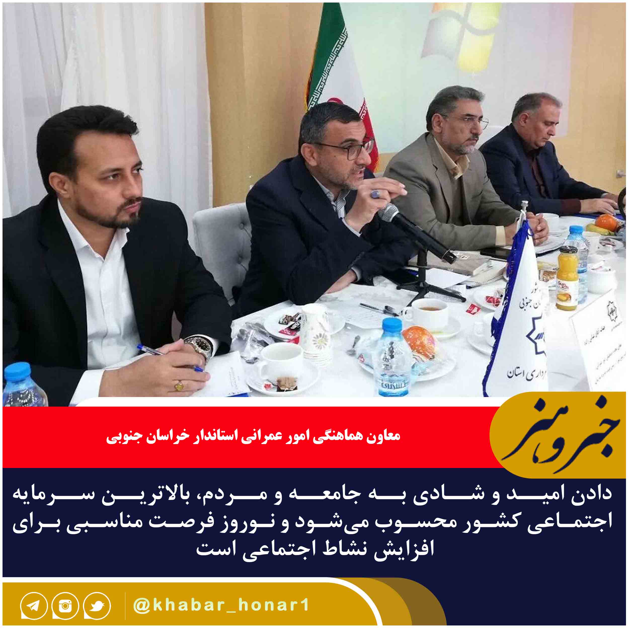 معاون هماهنگی امور عمرانی استاندار خراسان جنوبی گفت: دادن امید و شادی به جامعه و مردم، بالاترین سرمایه اجتماعی کشور محسوب میشود و نوروز فرصت مناسبی برای افزایش نشاط اجتماعی است.