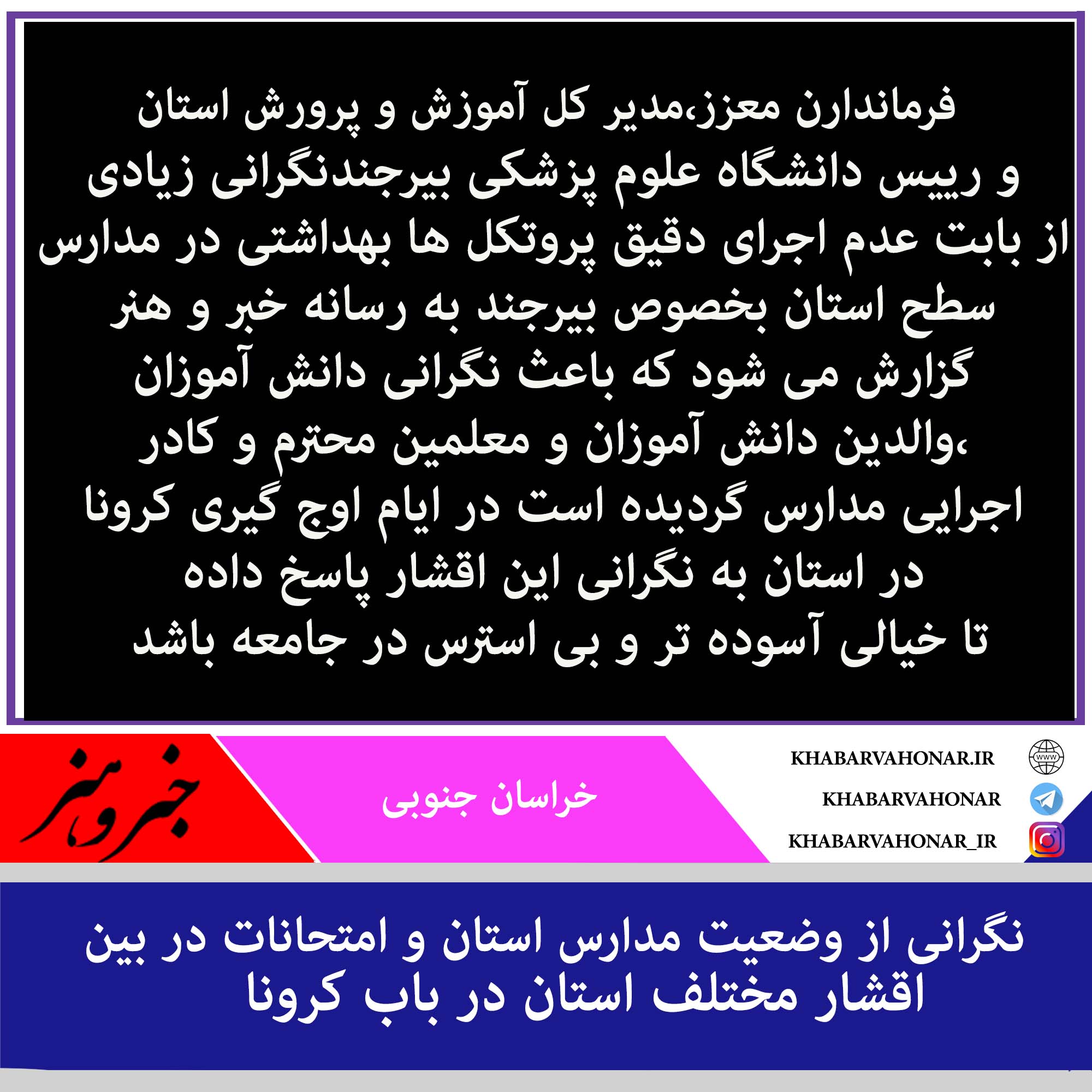 فرماندارن معزز،مدیر کل آموزش و پرورش استان و رییس دانشگاه علوم پزشکی بیرجندنگرانی زیادی از بابت عدم اجرای دقیق پروتکل ها بهداشتی در مدارس سطح استان بخصوص بیرجند به رسانه خبر و هنر گزارش می شود که باعث نگرانی دانش آموزان ،والدین دانش آموزان و معلمین محترم و کادر اجرایی مدارس گردیده است در ایام اوج گیری کرونا در استان به نگرانی این اقشار پاسخ داده تا خیالی آسوده تر و بی استرس در جامعه باشد