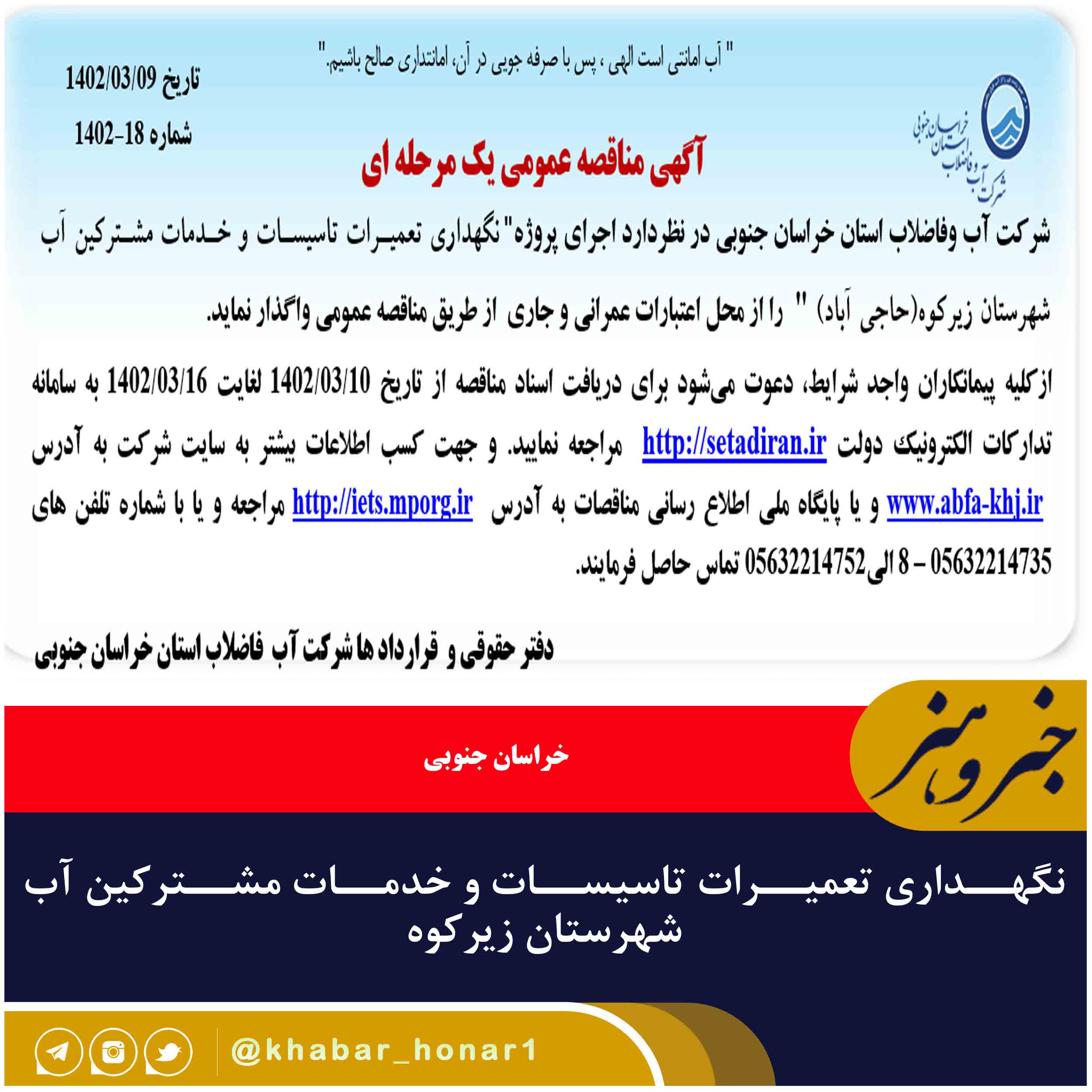 شرکت آب وفاضلاب استان خراسان جنوبی در نظردارد اجرای پروژه“ نگهداری تعمیرات تاسیسات و خدمات مشترکین آب شهرستان زیرکوه(حاجی آباد) ” را از محل اعتبارات عمرانی و جاری از طریق مناقصه عمومی واگذار نماید.