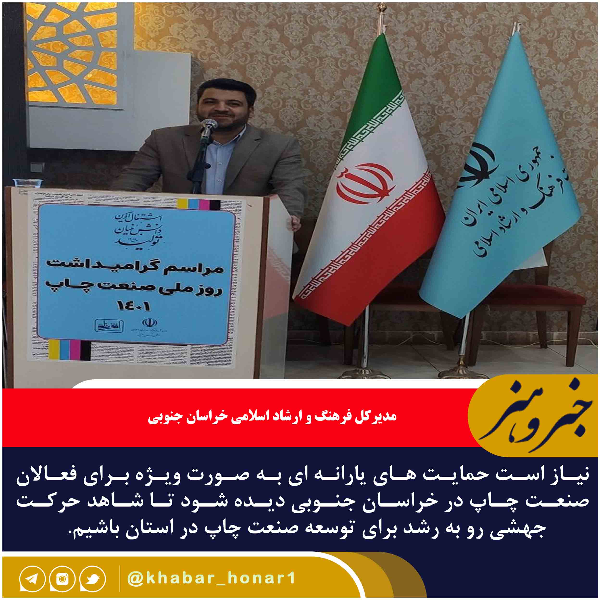 مدیرکل فرهنگ و ارشاد اسلامی خراسان جنوبی گفت: نیاز است حمایت های یارانه ای به صورت ویژه برای فعالان صنعت چاپ در خراسان جنوبی دیده شود تا شاهد حرکت جهشی رو به رشد برای توسعه صنعت چاپ در استان باشیم.علی فرخنده در مراسم گرامیداشت روز ملی صنعت چاپ که با حضور مدیر کل دفتر امور چاپ و نشر وزارت فرهنگ و ارشاد اسلامی، فعالان حوزه چاپ استان و جمعی از مسئولین استانی برگزار شد؛ با بیان اینکه خراسان جنوبی دارای ظرفیتی غنی در حوزه چاپ است، افزود: این استان مهد پدران علم و فرهنگ در حوزه های مختلف اعم از ریاضی و نجوم بوده که مغفول مانده اند.