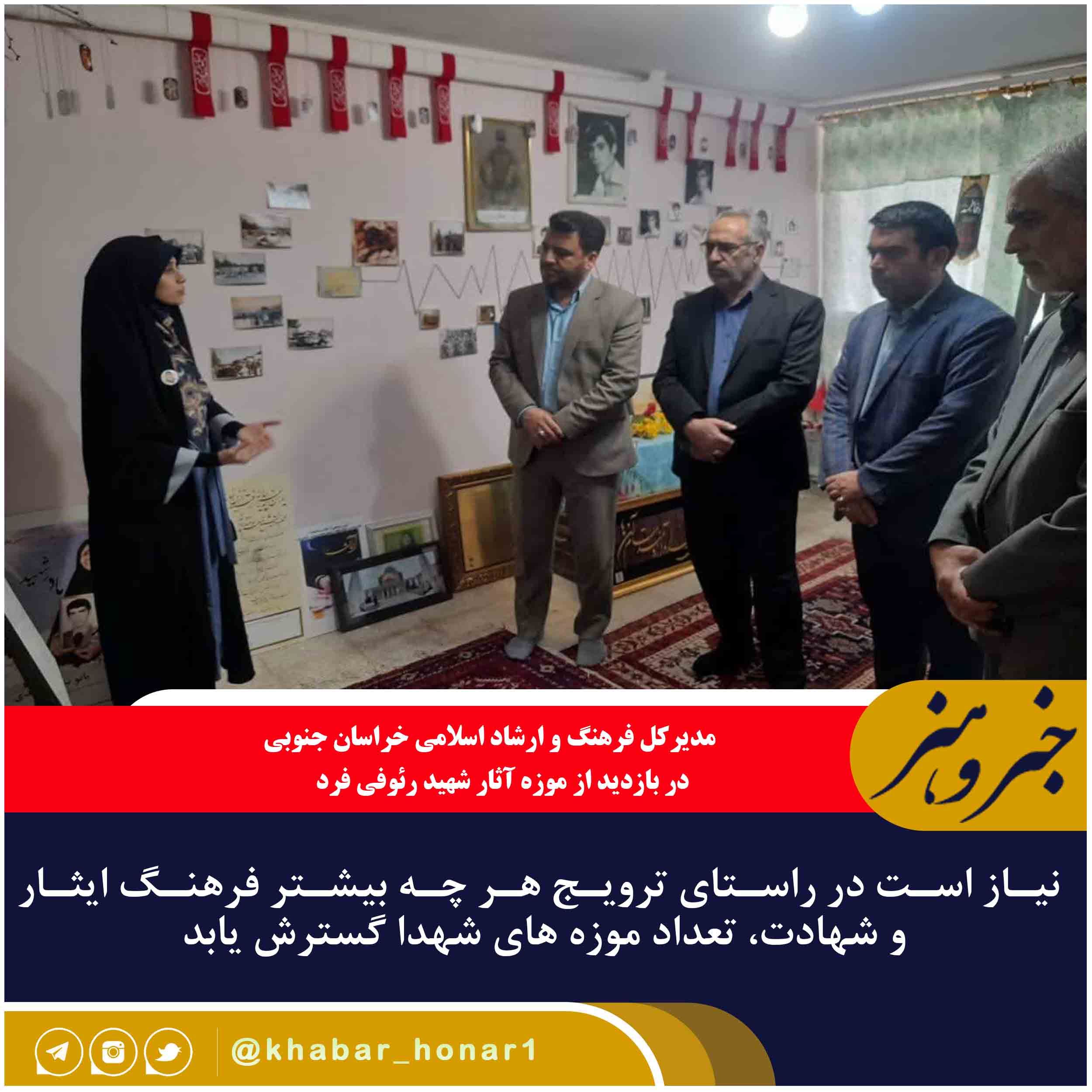 مدیرکل فرهنگ و ارشاد اسلامی خراسان جنوبی در بازدید از موزه آثار شهید رئوفی فرد گفت: نیاز است در راستای ترویج هر چه بیشتر فرهنگ ایثار و شهادت، تعداد موزه های شهدا گسترش یابد.