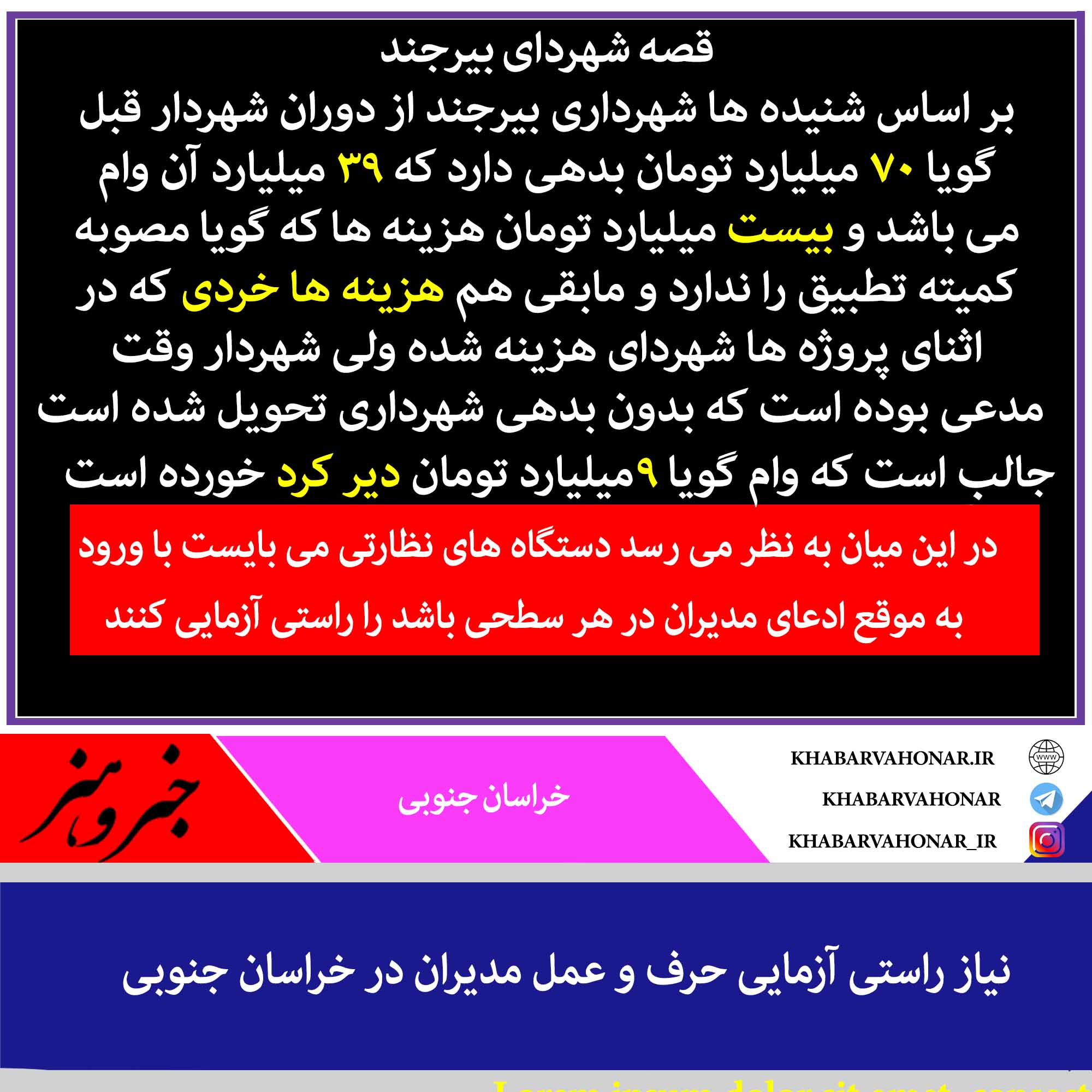 قصه شهردای بیرجند بر اساس شنیده ها شهرداری بیرجند از دوران شهردار قبل گویا ۷۰ میلیارد تومان بدهی دارد که ۳۹ میلیارد آن وام می باشد و بیست میلیارد تومان هزینه ها که گویا مصوبه کمیته تطبیق را ندارد و مابقی هم هزینه ها خردی که در اثنای پروژه ها شهردای هزینه شده ولی شهردار وقت مدعی بوده است که بدون بدهی شهرداری تحویل شده است جالب است که وام گویا ۹میلیارد تومان دیر کرد خورده است