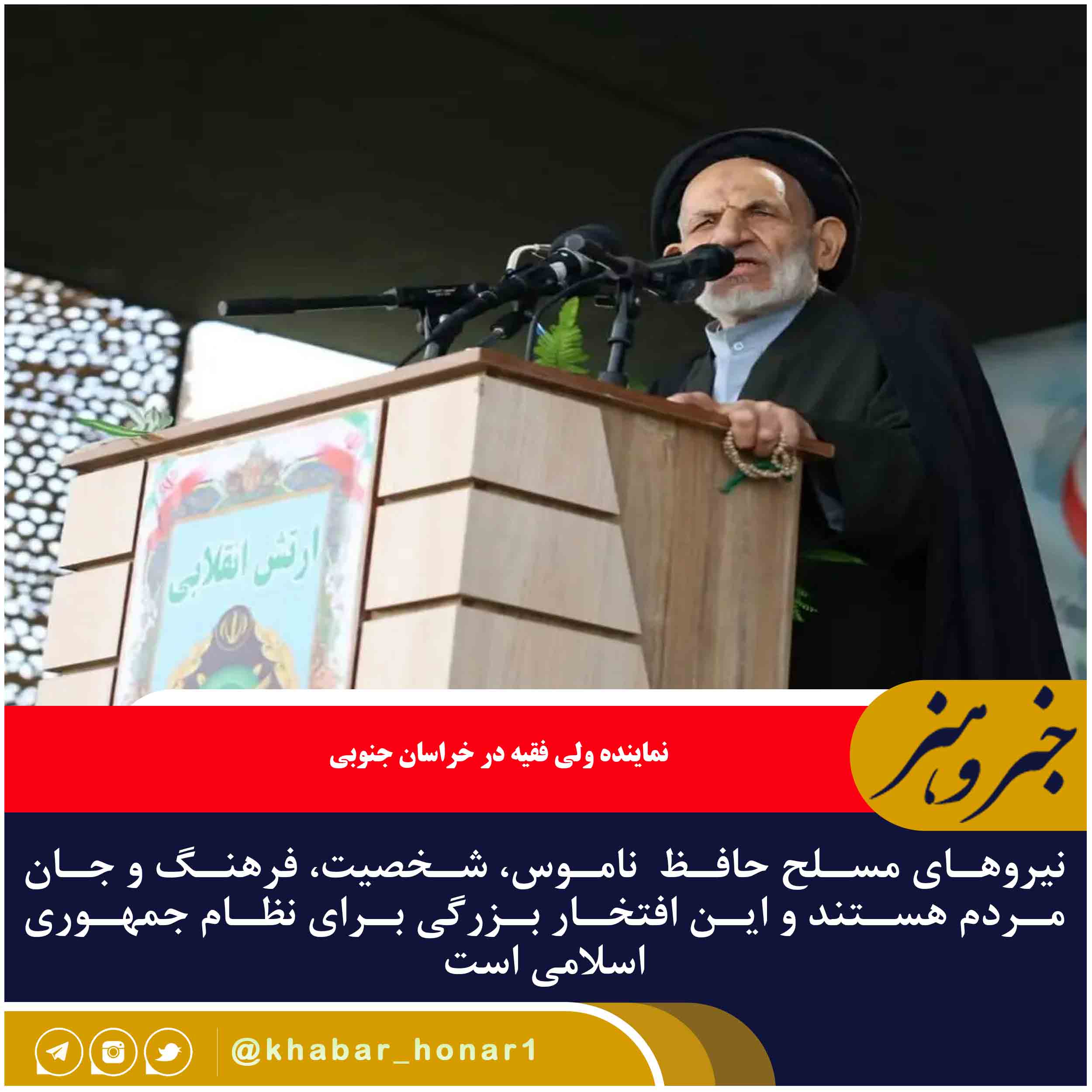 نماینده ولی فقیه در خراسان جنوبی و امام جمعه بیرجند با بیان اینکه در دین الهی مسئله جهاد و دفاع تشریع شده و واجب است گفت: نیروهای مسلح حافظ ناموس، شخصیت، فرهنگ و جان مردم هستند و این افتخار بزرگی برای نظام جمهوری اسلامی است.