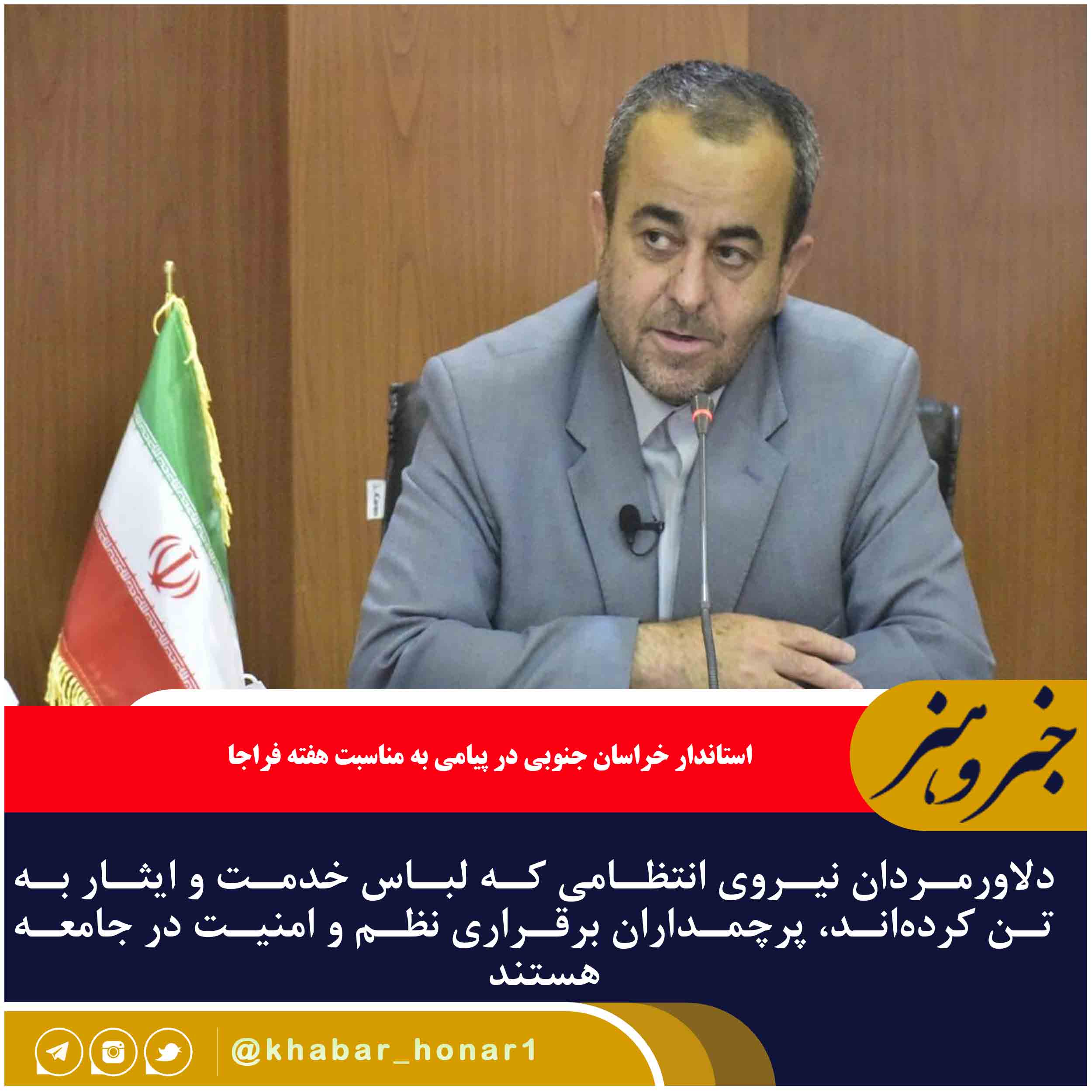 – استاندار خراسان جنوبی در پیامی به مناسبت هفته فراجا اظهار داشت: دلاورمردان نیروی انتظامی که لباس خدمت و ایثار به تن کردهاند، پرچمداران برقراری نظم و امنیت در جامعه هستند.