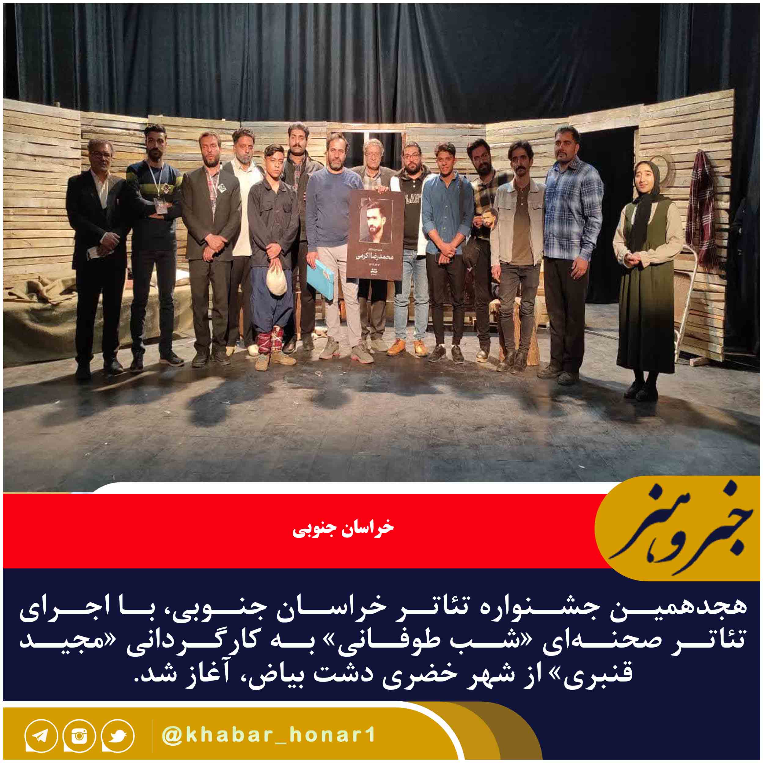 هجدهمین جشنواره تئاتر خراسان جنوبی، با اجرای تئاتر صحنهای «شب طوفانی» به کارگردانی «مجید قنبری» از شهر خضری دشت بیاض، آغاز شد.