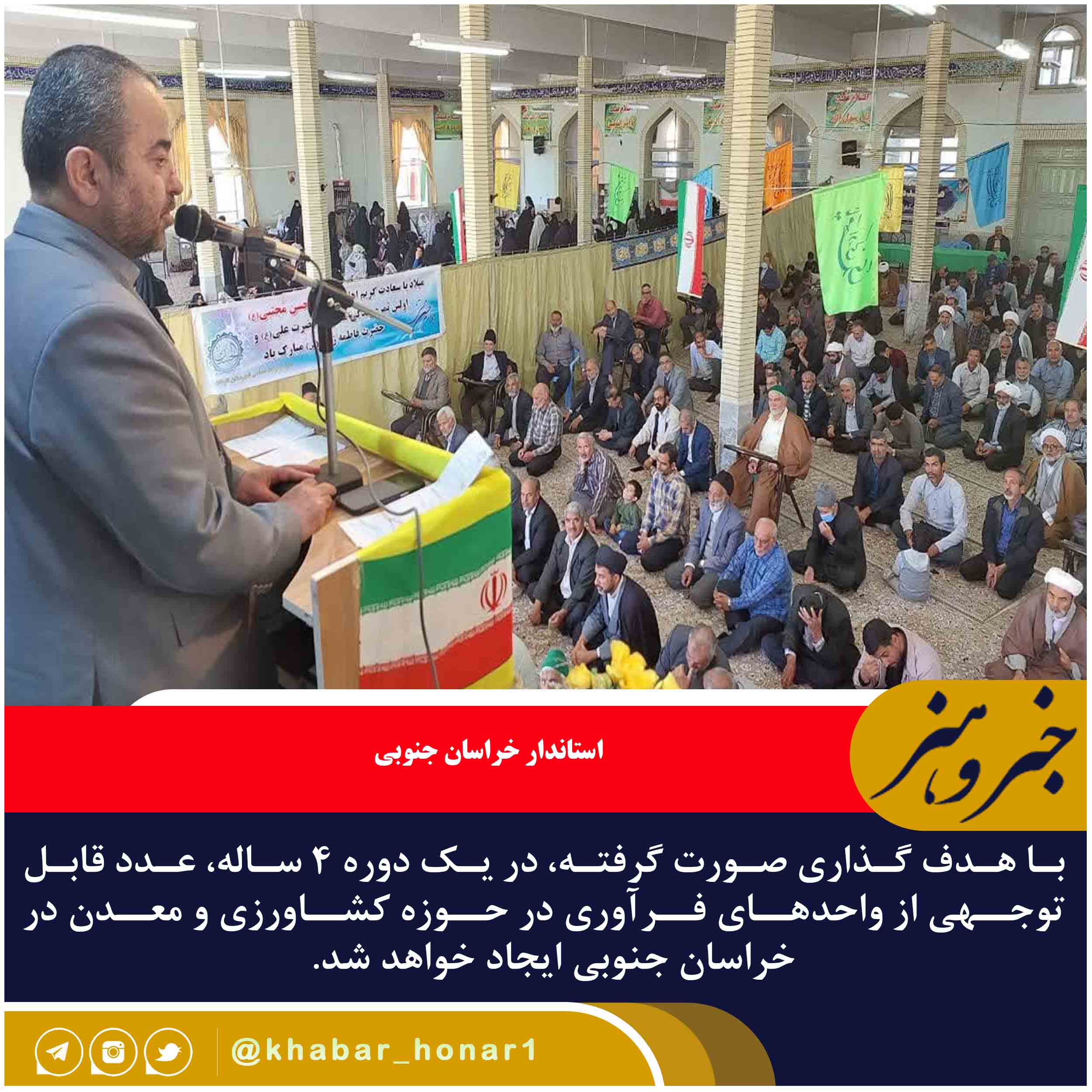 ?استاندار خراسان جنوبی تأکید کرد: با هدف گذاری صورت گرفته، در یک دوره ۴ ساله، عدد قابل توجهی از واحدهای فرآوری در حوزه کشاورزی و معدن در خراسان جنوبی ایجاد خواهد شد.