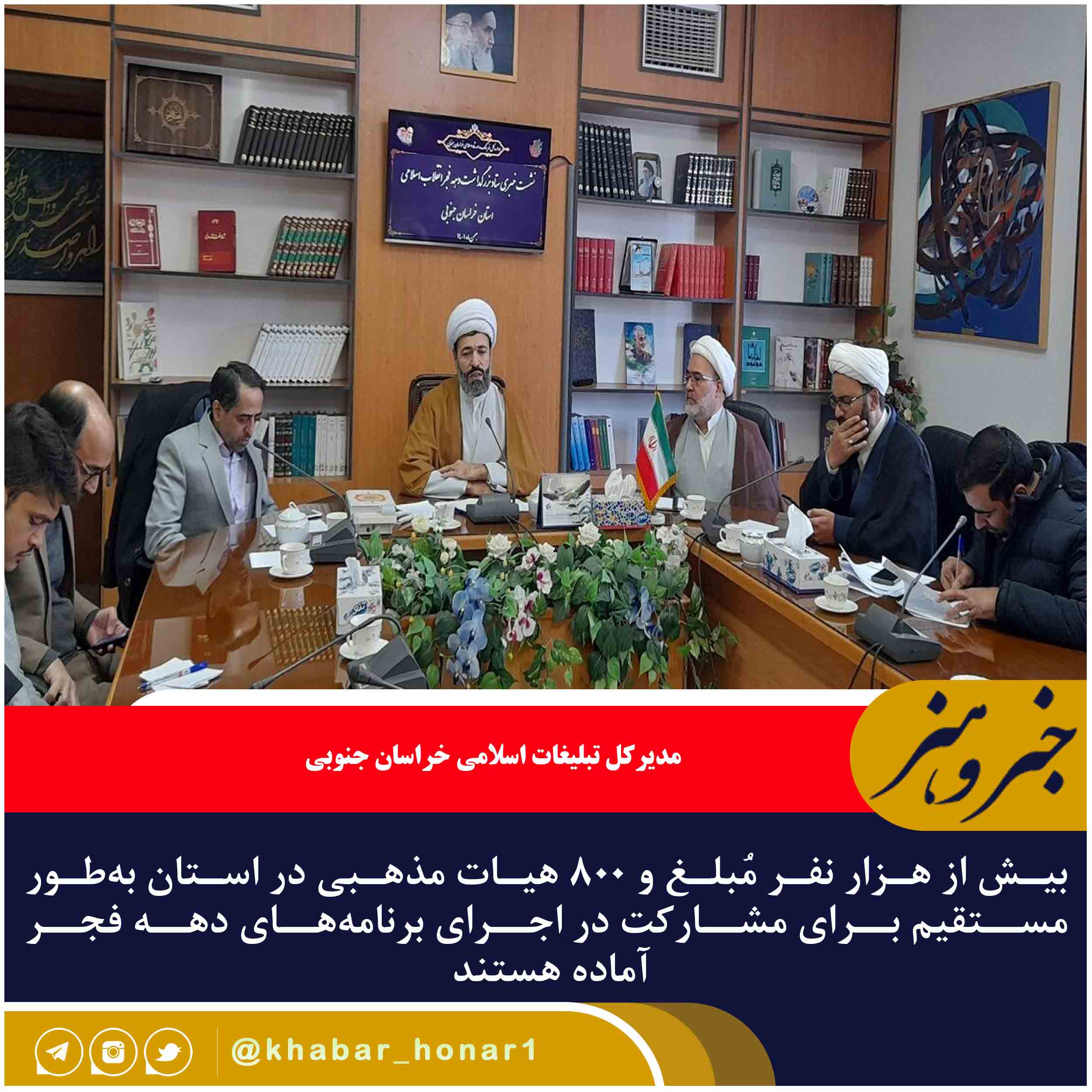 مدیرکل تبلیغات اسلامی خراسان جنوبی گفت: بیش از هزار نفر مُبلغ و ۸۰۰ هیات مذهبی در استان بهطور مستقیم برای مشارکت در اجرای برنامههای دهه فجر آماده هستند.