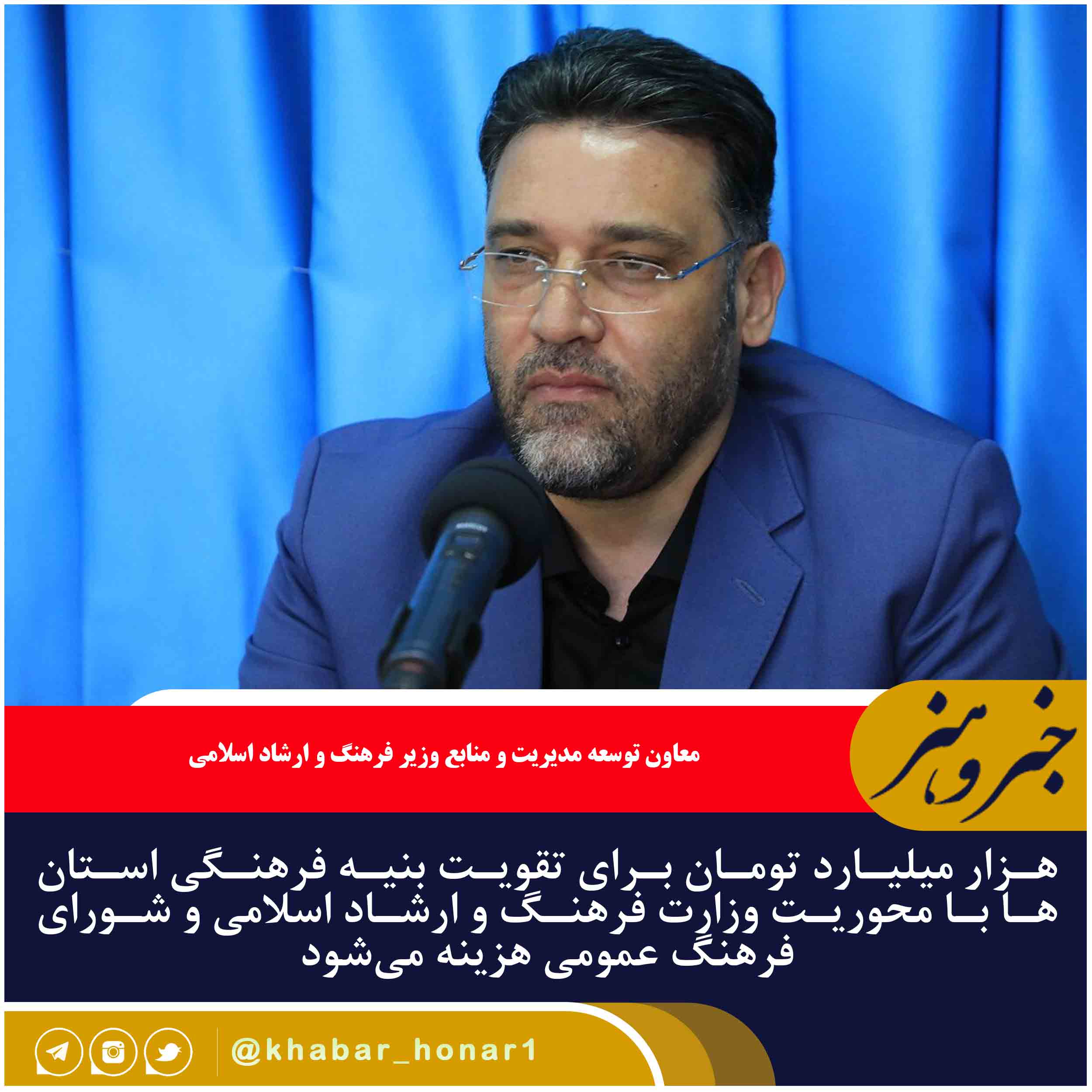 معاون توسعه مدیریت و منابع وزیر فرهنگ و ارشاد اسلامی گفت: امسال هزار میلیارد تومان برای تقویت بنیه فرهنگی استانها با محوریت وزارت فرهنگ و ارشاد اسلامی و شورای فرهنگ عمومی هزینه میشود.