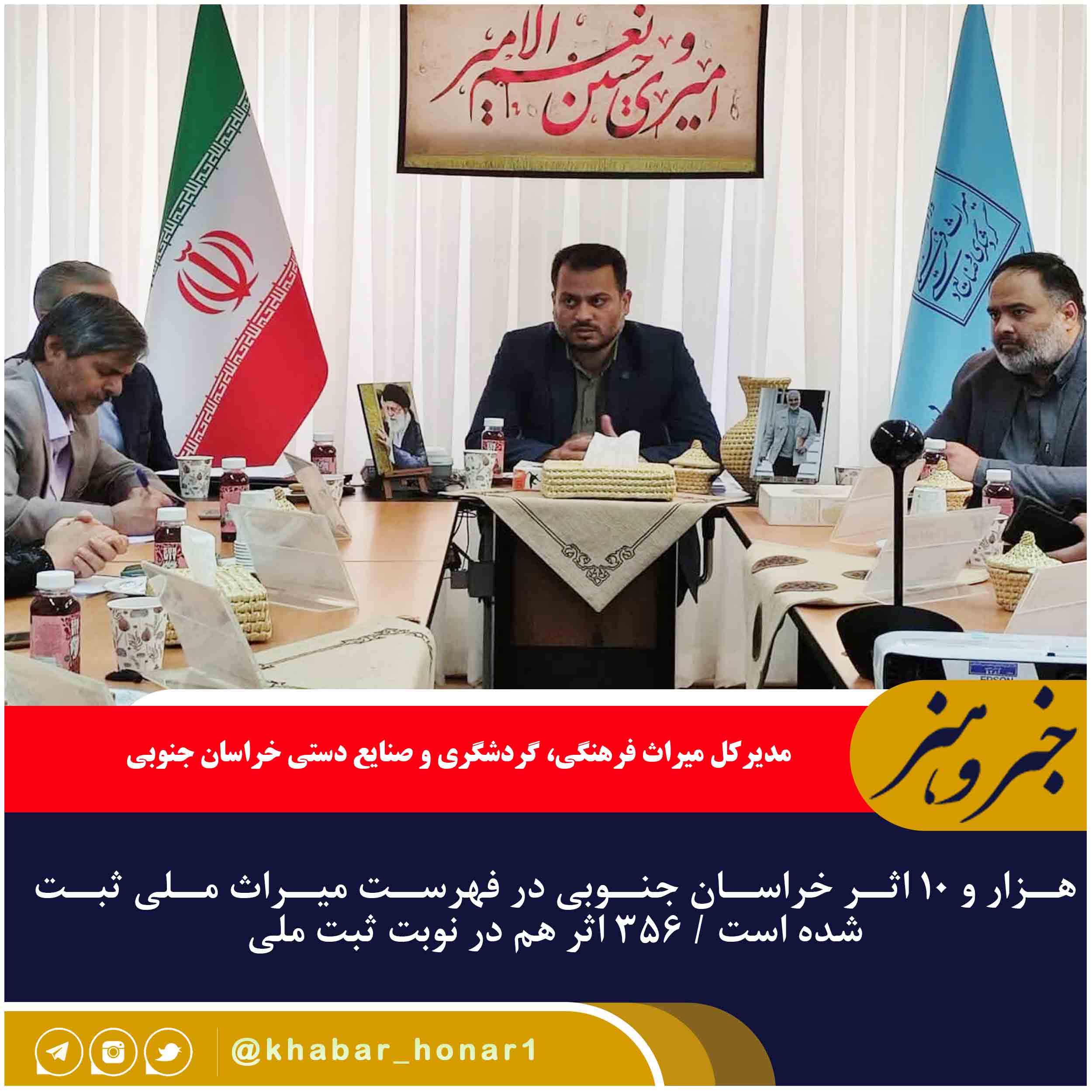 مدیرکل میراث فرهنگی، گردشگری و صنایع دستی خراسان جنوبی گفت: تعداد آثار این استان در فهرست میراث ملی به هزار و ۱۰ اثر رسیده و ۳۵۶ اثر هم در نوبت ثبت ملی است.