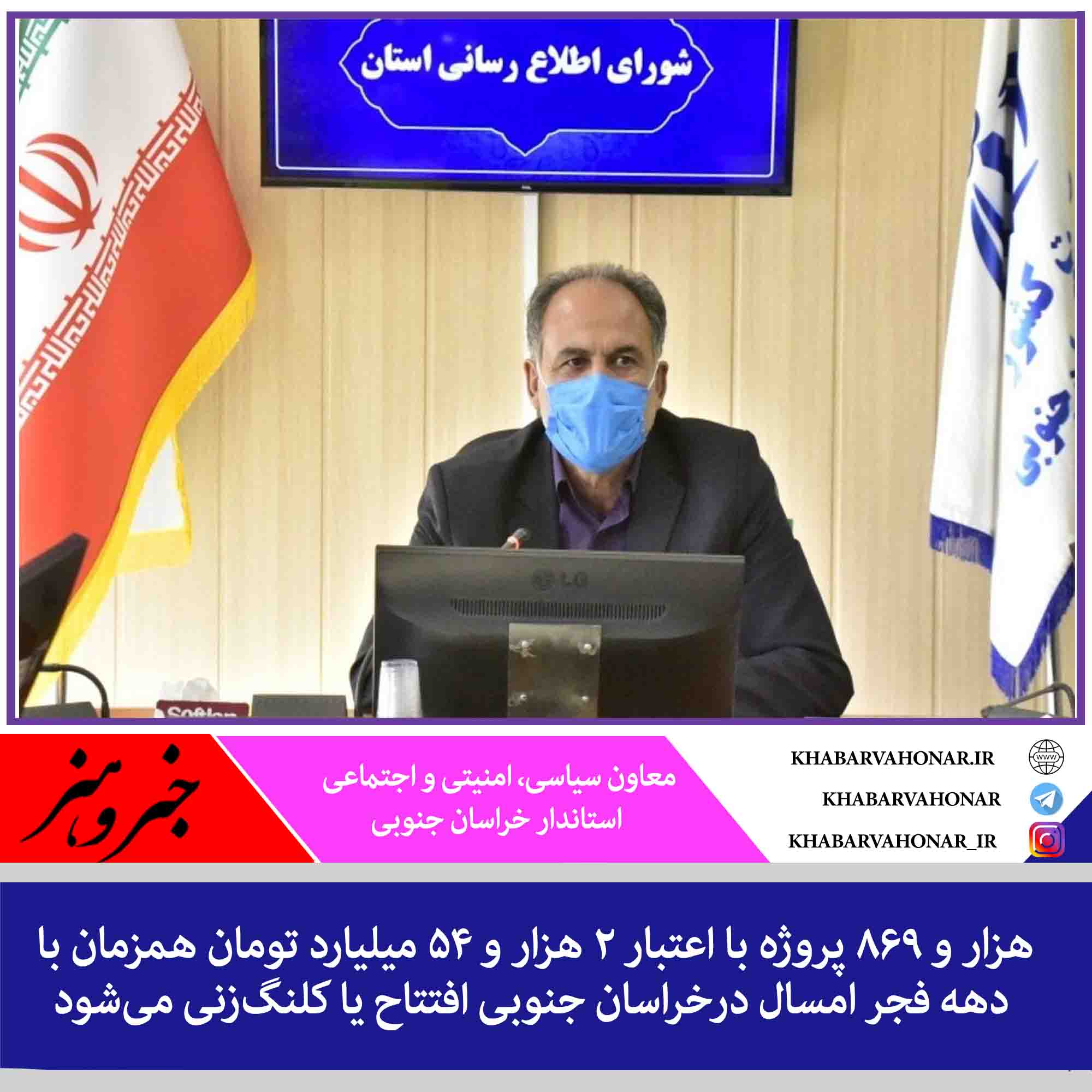 معاون سیاسی، امنیتی و اجتماعی استاندار خراسان جنوبی گفت: هزار و ۸۶۹ پروژه با اعتبار ۲ هزار و ۵۴ میلیارد تومان همزمان با دهه فجر امسال در این استان افتتاح یا کلنگزنی میشود که ۵۸ درصد آنها متعلق به مناطق روستایی است.