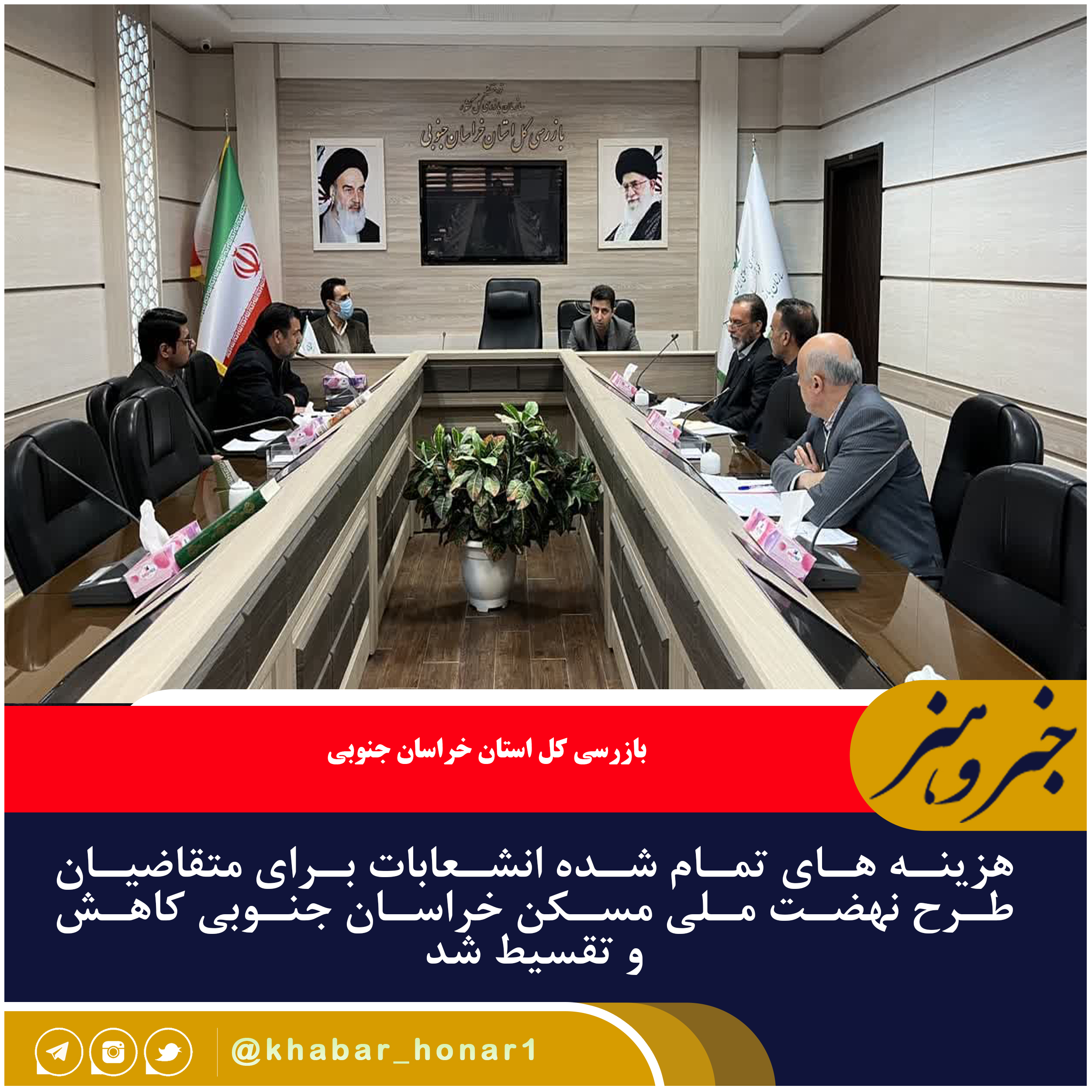 در جلسه ای با حضور مدیر کل راه و شهرسازی استان خراسان جنوبی، مدیر عامل شرکت آب و فاضلاب استان خراسان جنوبی، معاون شرکت توزیع نیروی برق استان خراسان جنوبی ونماینده انبوه سازان دربازرسی کل استان برگزار و باتوجه به ضرورت تسریع در نصب انشعابات طرح نهضت ملی مسکن به منظور جلوگیری از افزایش هزینه تمام شده آن طرح با توجه به افزایش تعرفه های احتمالی آتی، در خصوص نحوه پرداخت حق انشعابات (با لحاظ رعایت حال متقاضیان طرح نهضت ملی مسکن) تصمیماتی اخد شد.