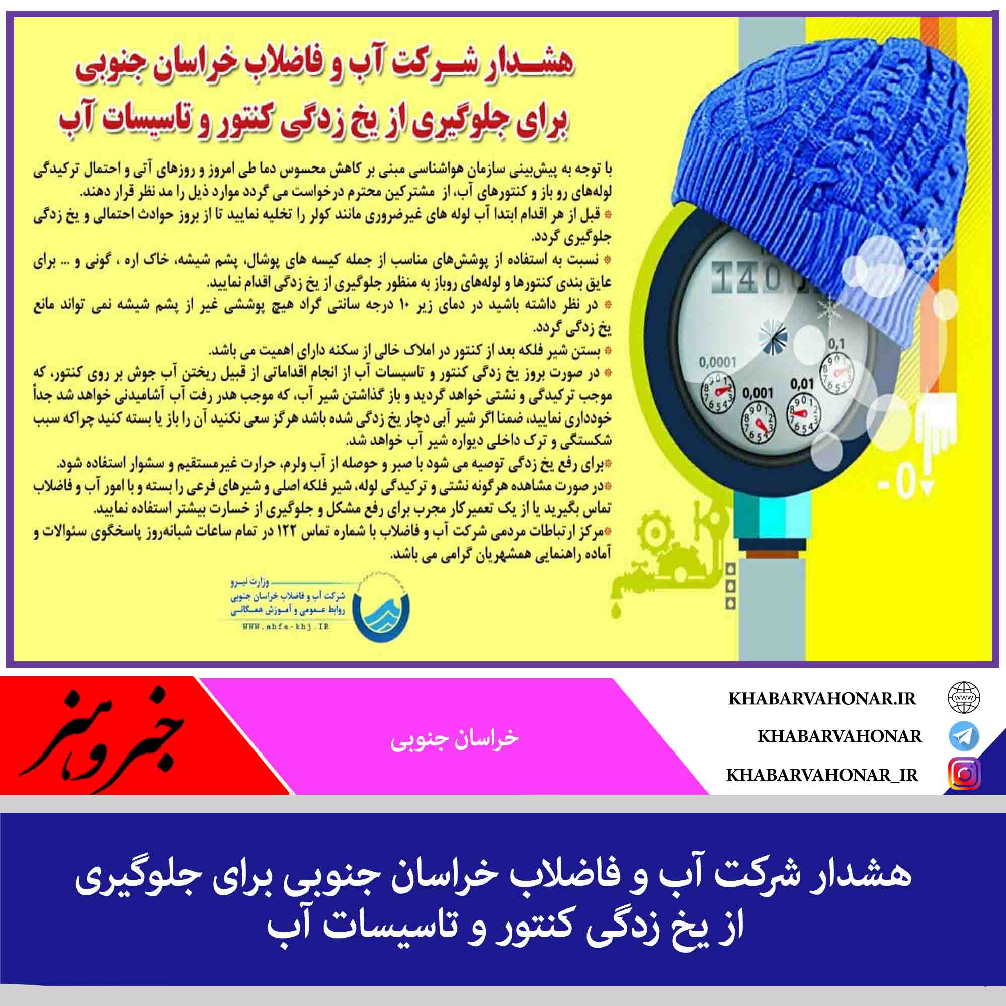 هشدار شرکت آب و فاضلاب خراسان جنوبی برای جلوگیری از یخ زدگی کنتور و تاسیسات آب