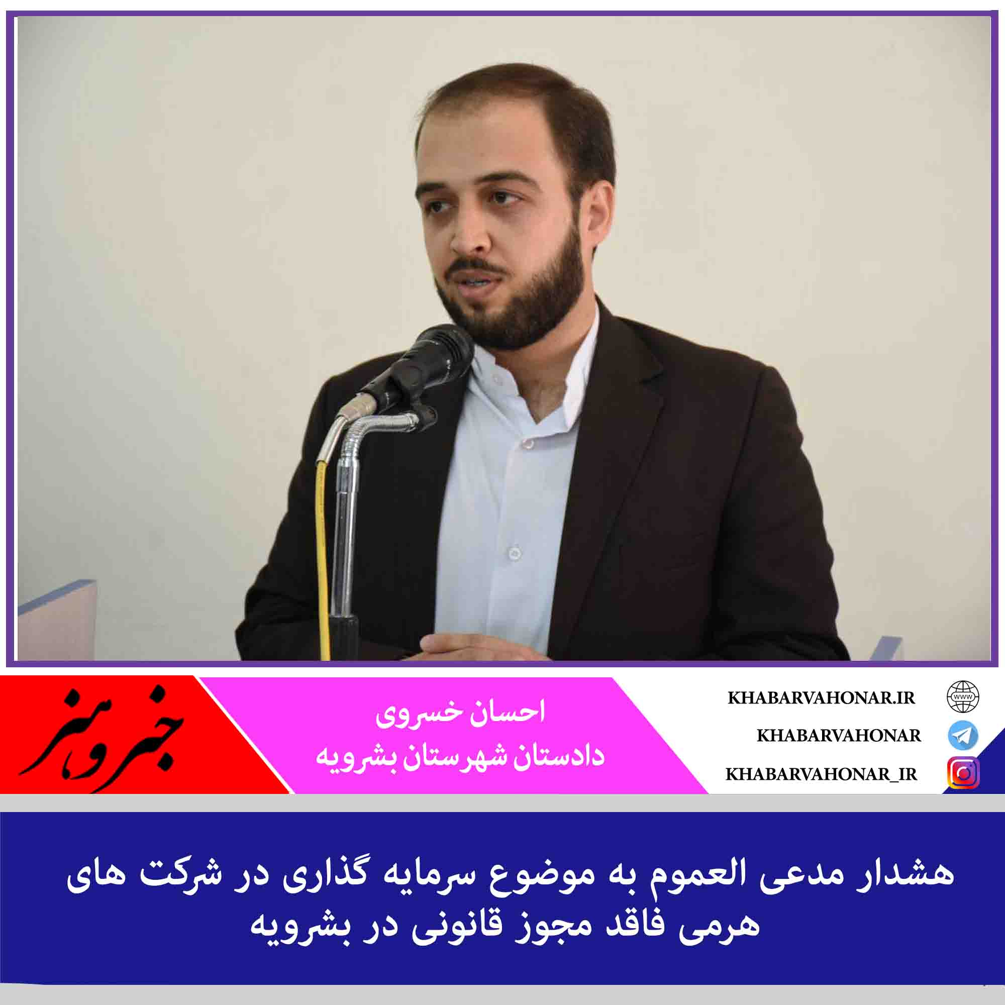 ?دادستان بشرویه تاکید کرد: جهت جلوگیری از سوءاستفادههای احتمالی و ورود ضرر و زیان به افراد از هرگونه عضویت و فعالیت در این شرکتها خودداری کرده و در صورت ارائه پیشنهاد عضویت از سوی هر شخص مراتب به دفتر دادستانی و یا پلیس آگاهی اطلاع داده شود تا با مشارکت همگانی از فعالیت شرکتهای هرمی و اتلاف اموال مردم و تشکیل پروندههای متعدد قضایی جلوگیری به عمل آید .