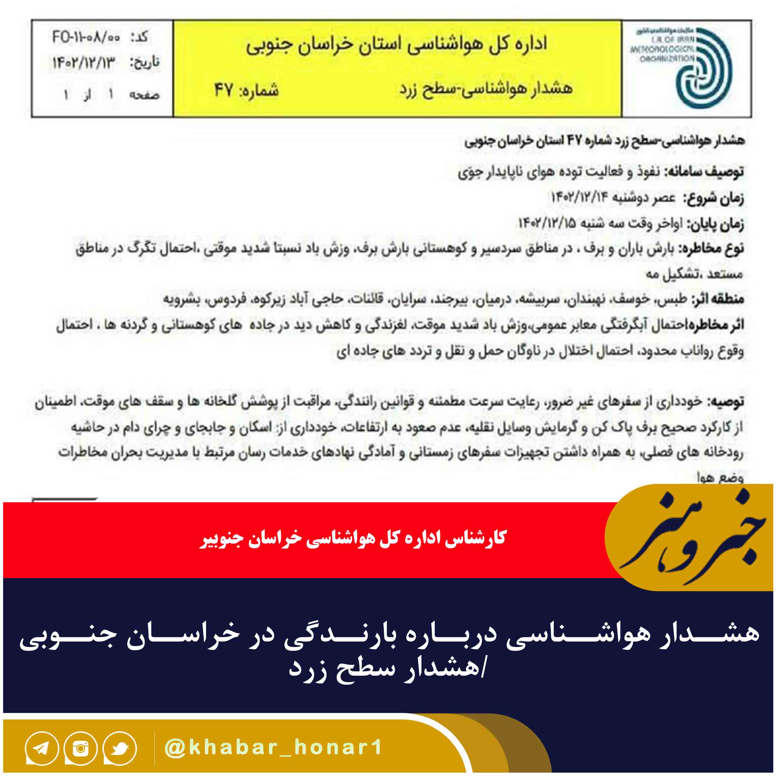 اداره کل هواشناسی خراسان جنوبی درباره نفوذ و فعالیت توده هوای ناپایدار جوی از امروز تا فردا (سهشنبه) در این استان هشدار سطح زرد صادر کرد.