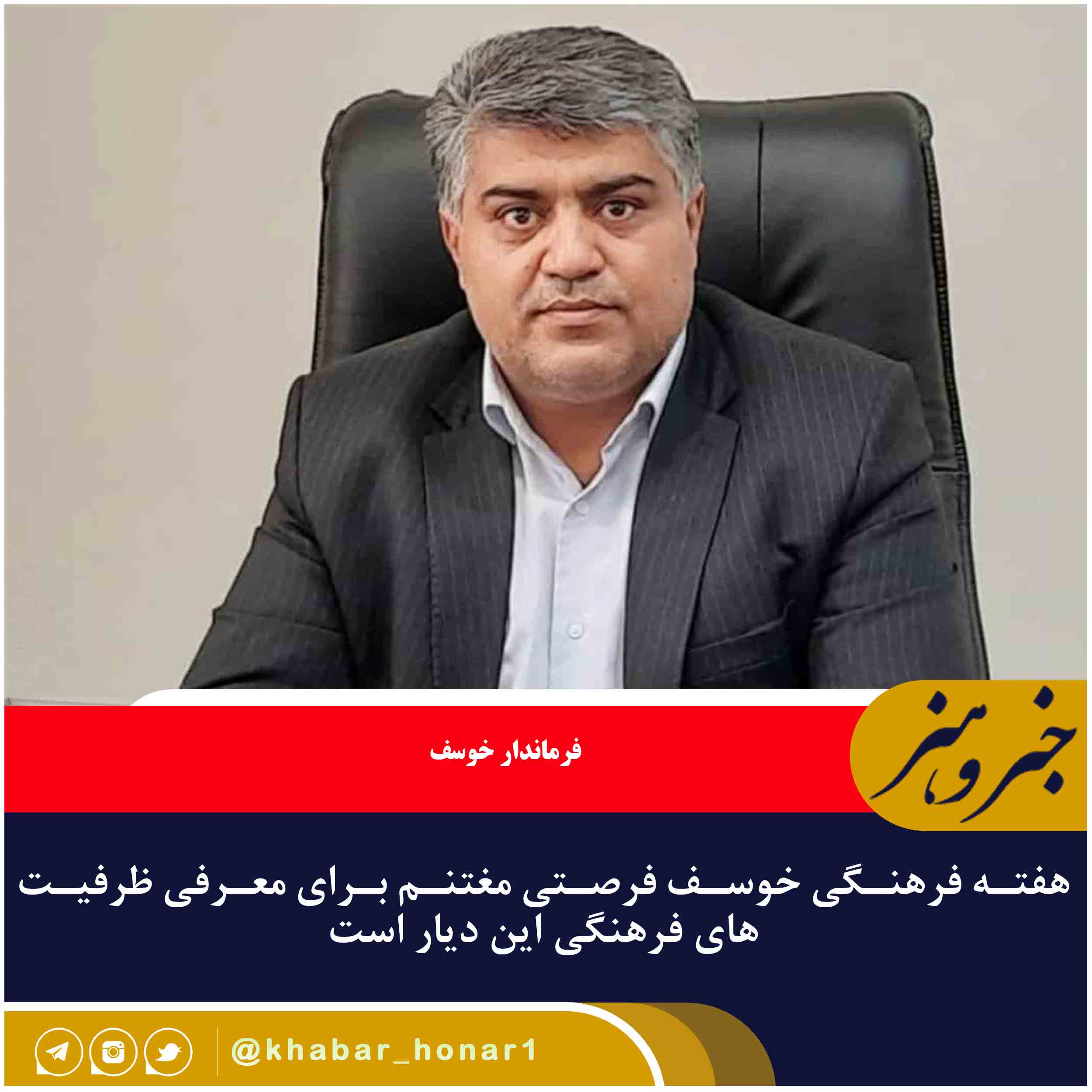 فرماندار خوسف اعلام کرد: آیین گرامیداشت هفته فرهنگی این شهرستان از ۲۲ تا ۲۸ آبان ۱۴۰۴ با هدف معرفی گسترده‌تر ظرفیت‌های فرهنگی، تاریخی و اجتماعی این خطه برگزار می‌شود.