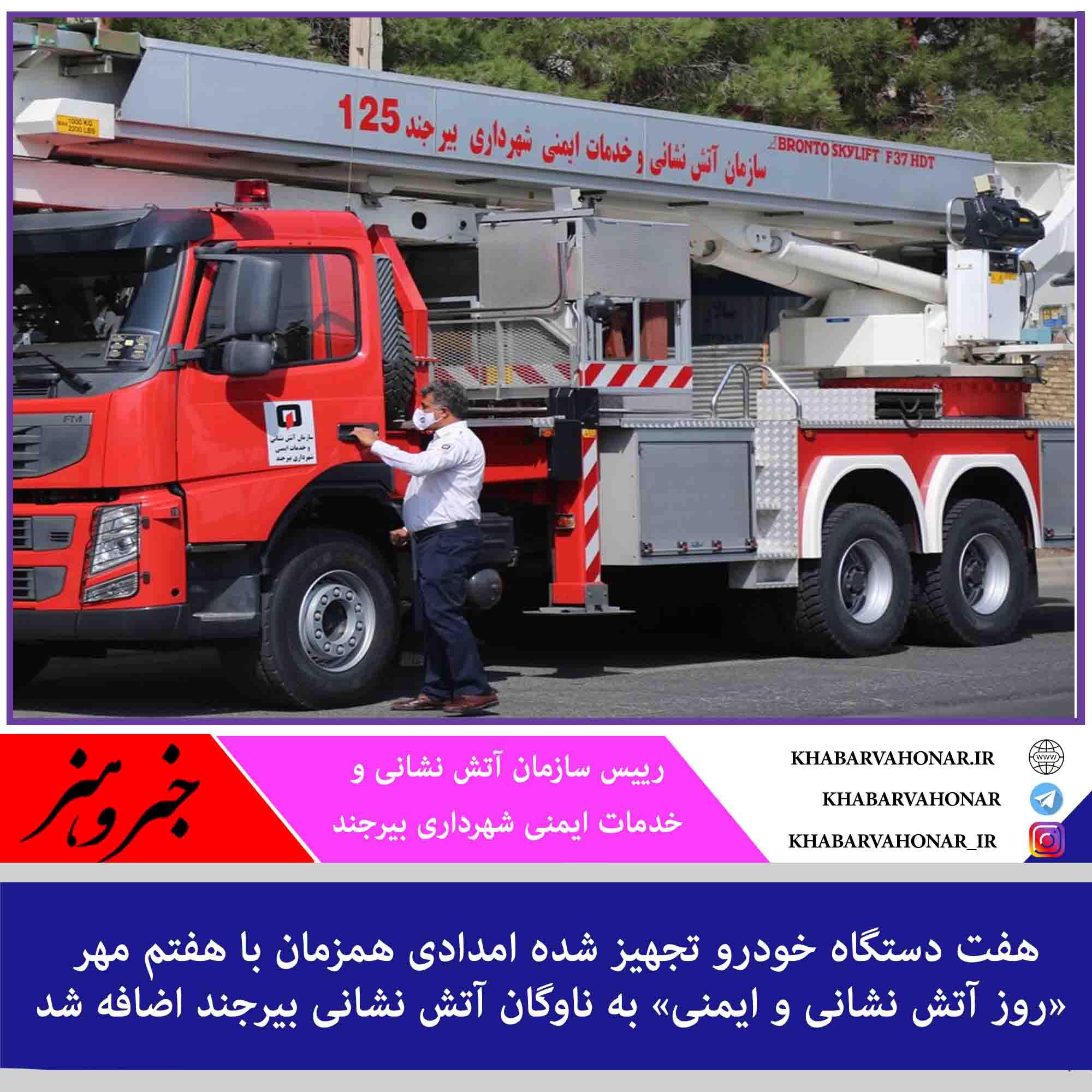 هفت دستگاه خودرو تجهیز شده امدادی همزمان با هفتم مهر «روز آتش نشانی و ایمنی» به ناوگان آتش نشانی بیرجند اضافه شد.