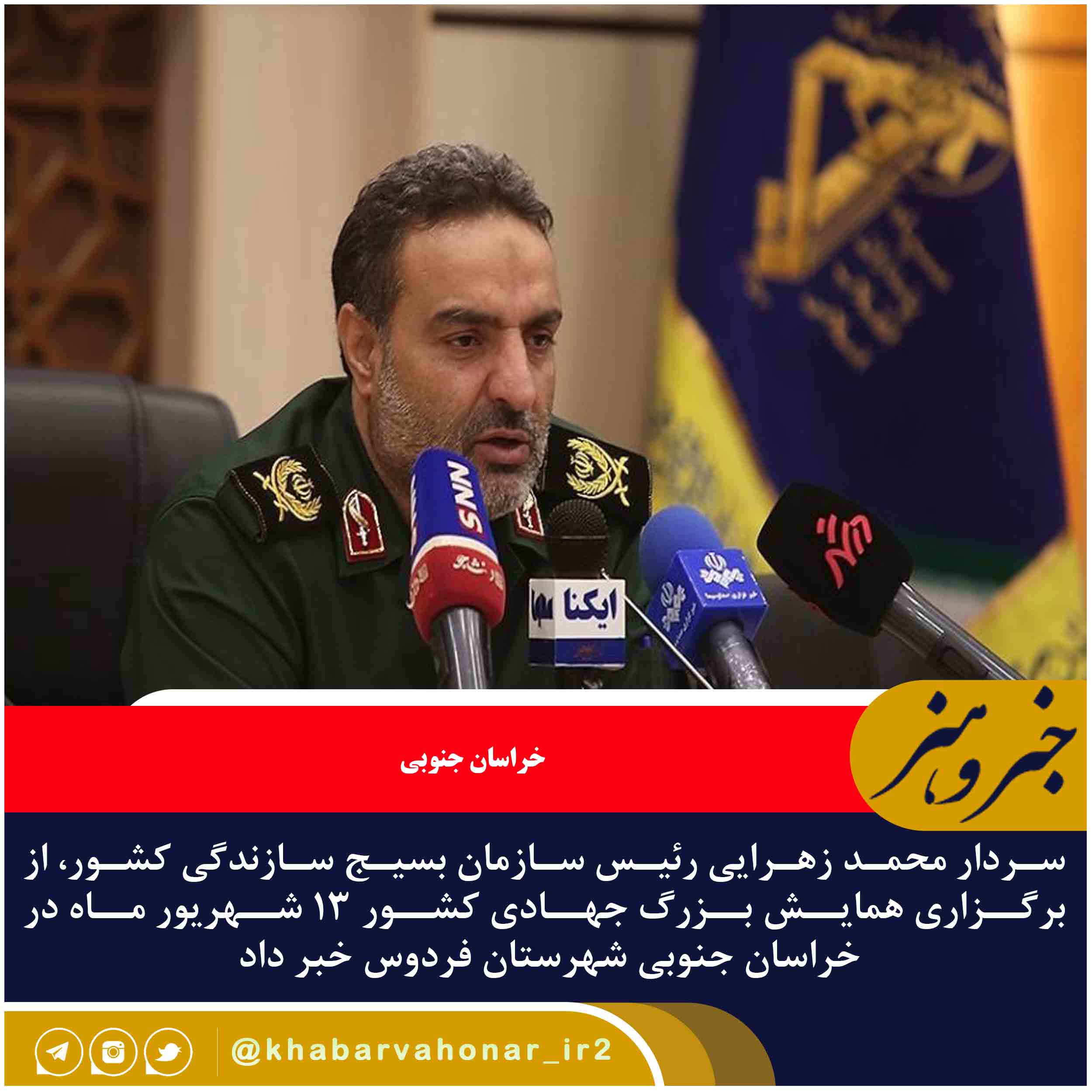 سردار محمد زهرایی رئیس سازمان بسیج سازندگی کشور، از برگزاری همایش بزرگ جهادی کشور۱۳ شهریور ماه در خراسان جنوبی شهرستان فردوس خبر داد.